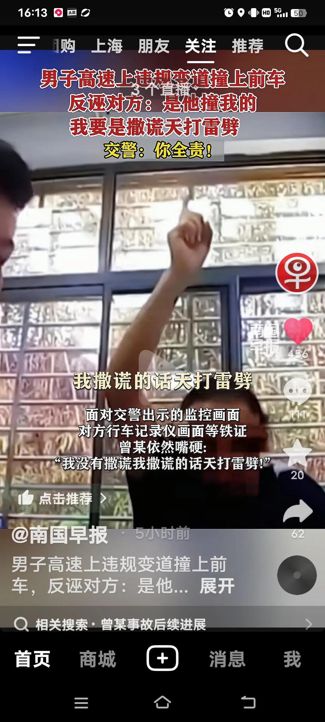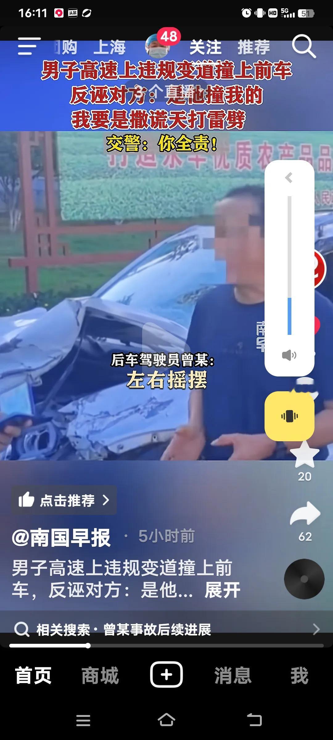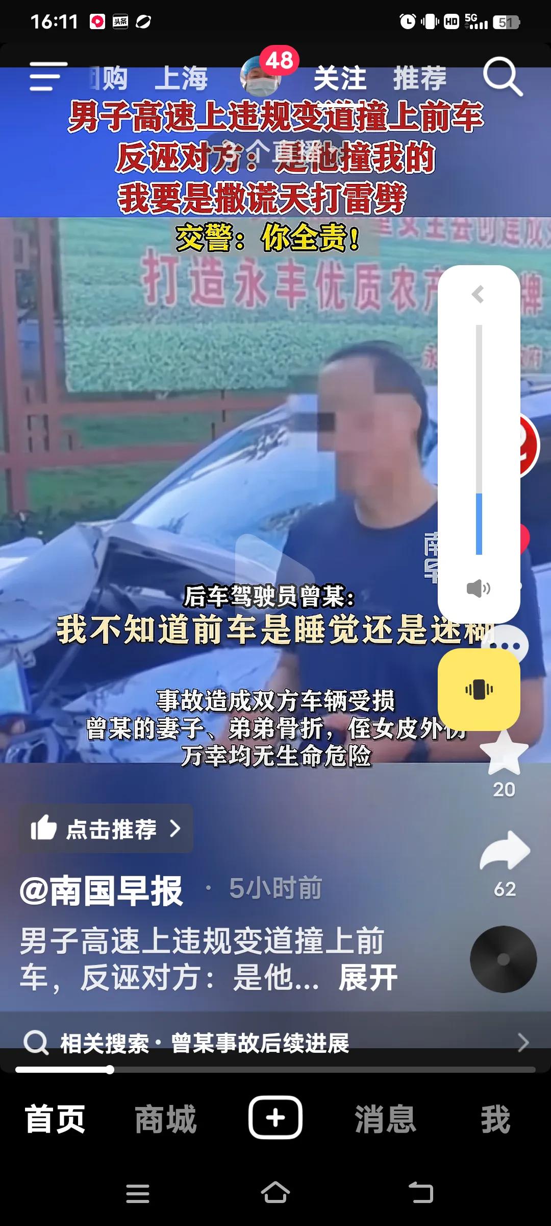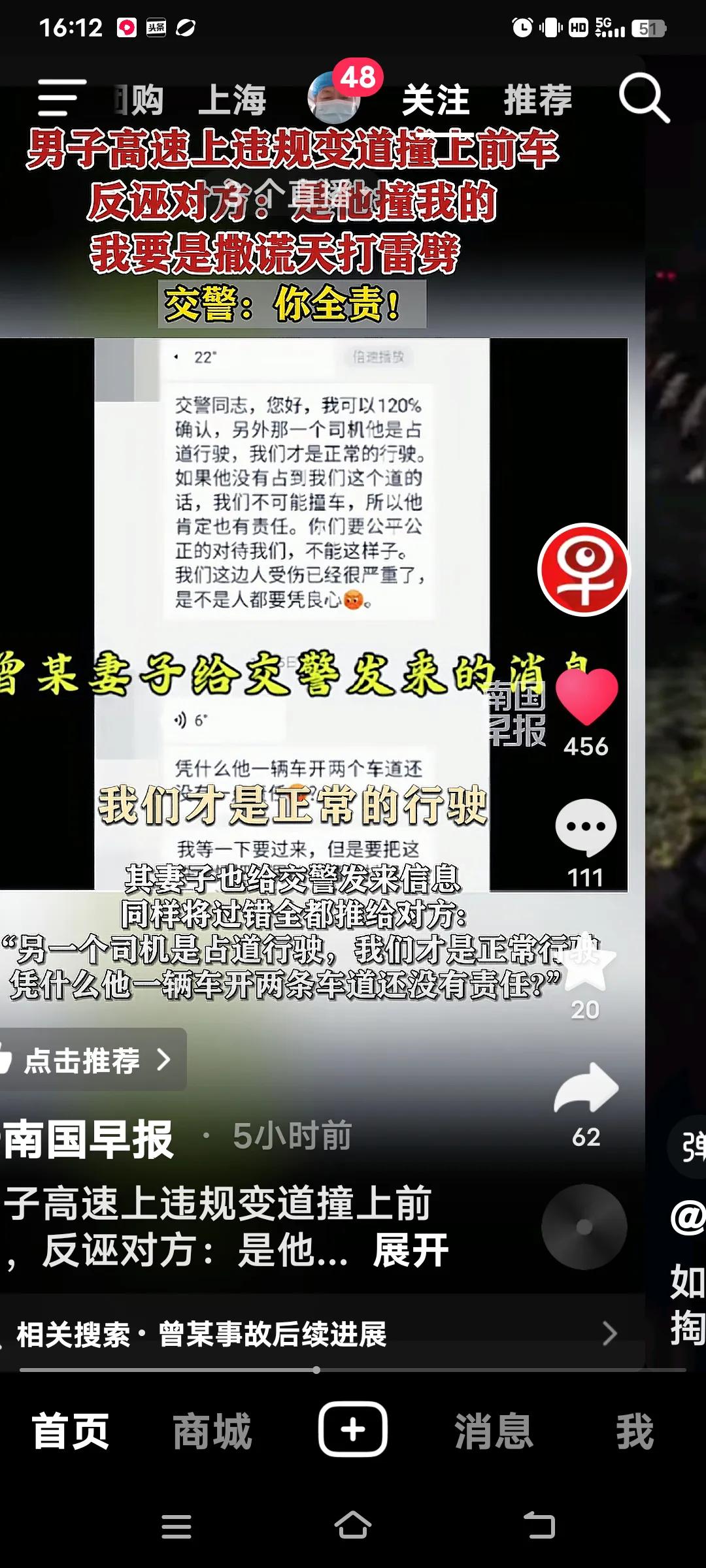 高速上违规变道撞上前车,交警:你全责! 10月4日,江西抚吉高速永丰段,曾某驾车车里有(妻子,弟弟和侄女),在慢车道行驶时,突然向左变道,致双方发生碰撞,曾某车四轮朝天翻车。事故双方受损,曾某的妻子和弟弟骨折,侄女皮外伤,幸好没有生命危险。 交警到场,面对交警的监控记录仪,曾某不仅认为自己无错还嘴硬的说,前面的车左右摇摆不知道可是睡着了?交警让他说话负责,他说“负百分之百的责,”手举高高的,如果说假天打雷劈。曾某的妻子也给交警发信息,同样也是把责任推给对方。反而还说做人是不是要凭良心?她的人伤的过重了! 好在遇到一个好的交警,就是你曾某的全责,又对他批评教育。再说了你撞向前面的车。人已经够倒霉的了,不能因为你们伤的重,就推卸责任,都是有监控的。不能随便反诬对方吧,必须为这样的好交警点赞!全责交通事故 追尾赔偿 高速路追尾 高速变道事故