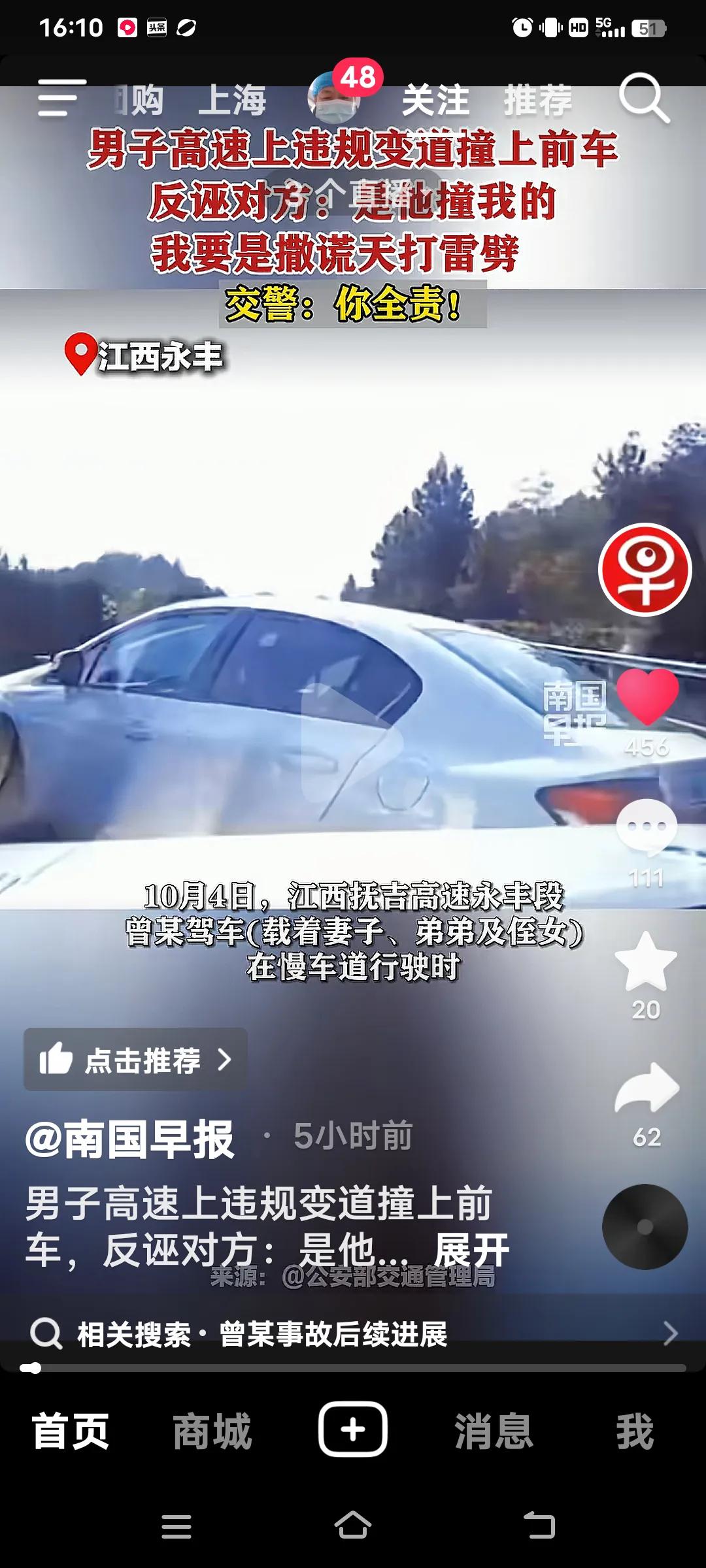高速上违规变道撞上前车,交警:你全责! 10月4日,江西抚吉高速永丰段,曾某驾