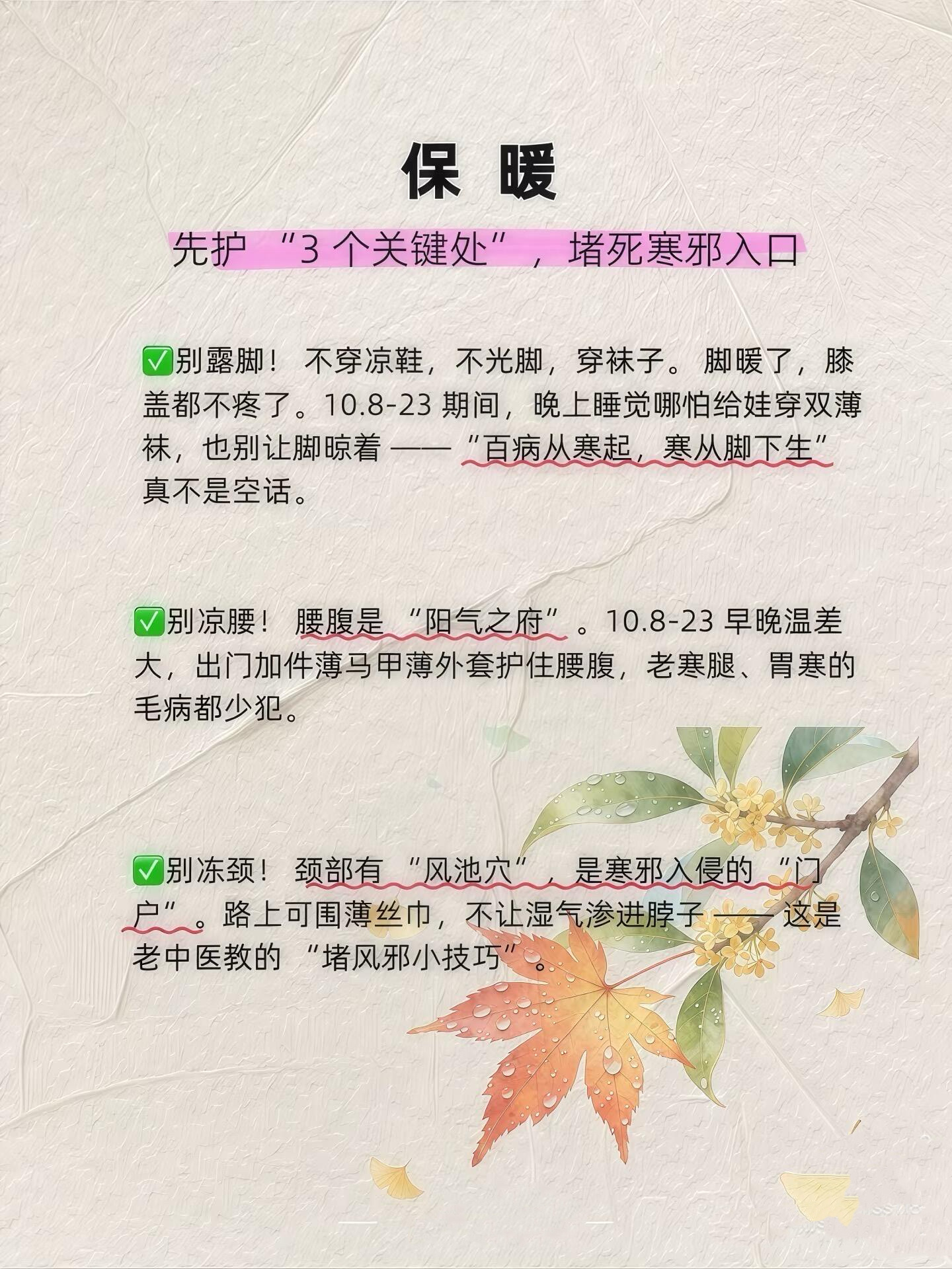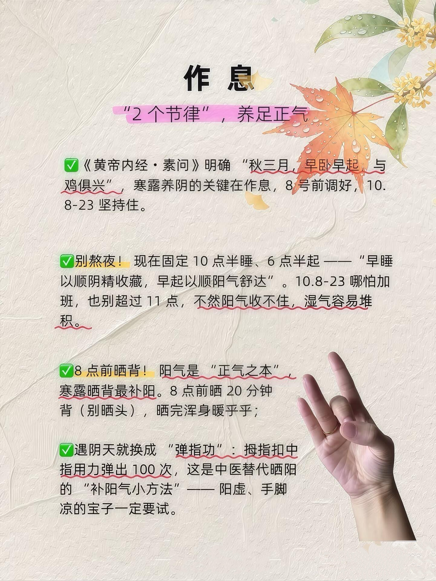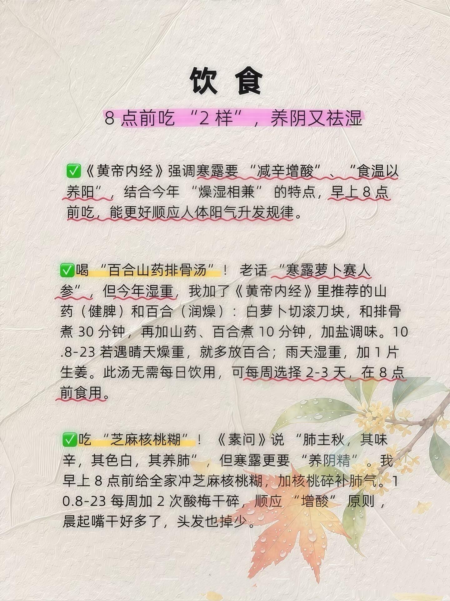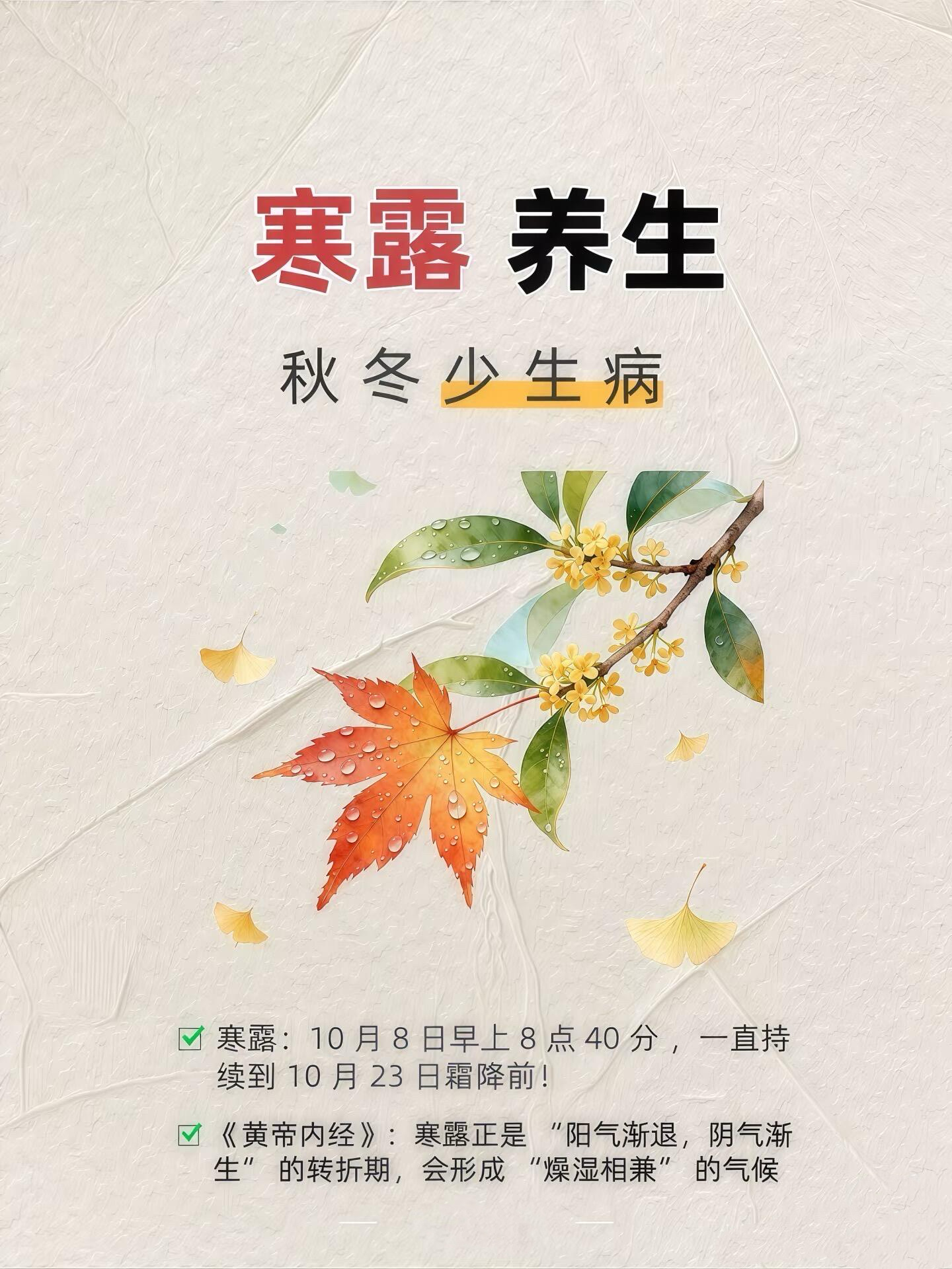 👉🏻 简单概括来说:秋季(含寒露)是阳气渐减、阴气渐长的阶段,气候特点是“燥湿交织”,寒邪易裹着湿气入侵人体;而养护核心是遵循“秋冬养阴”原则,把自身正气养足,就能减少邪气侵袭。