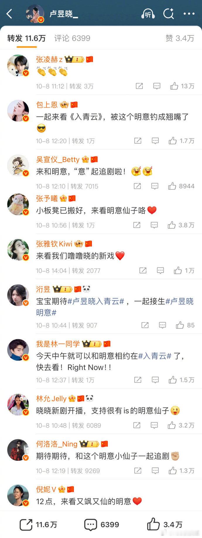 最近两天,继李沁、陈哲远拼命为《一笑随歌》而摇人宣传后,侯明昊、卢昱晓也开始为《入青云》摇人。