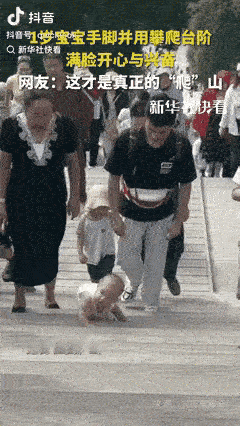 庐山1岁宝宝这波“硬核爬山”,萌化了!戴护膝手脚并用爬台阶,肉脸憋得通红还咯咯笑