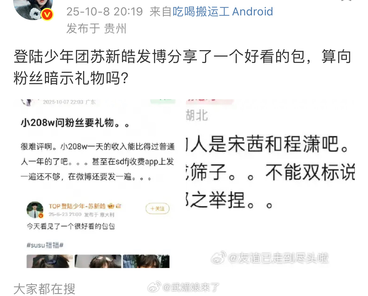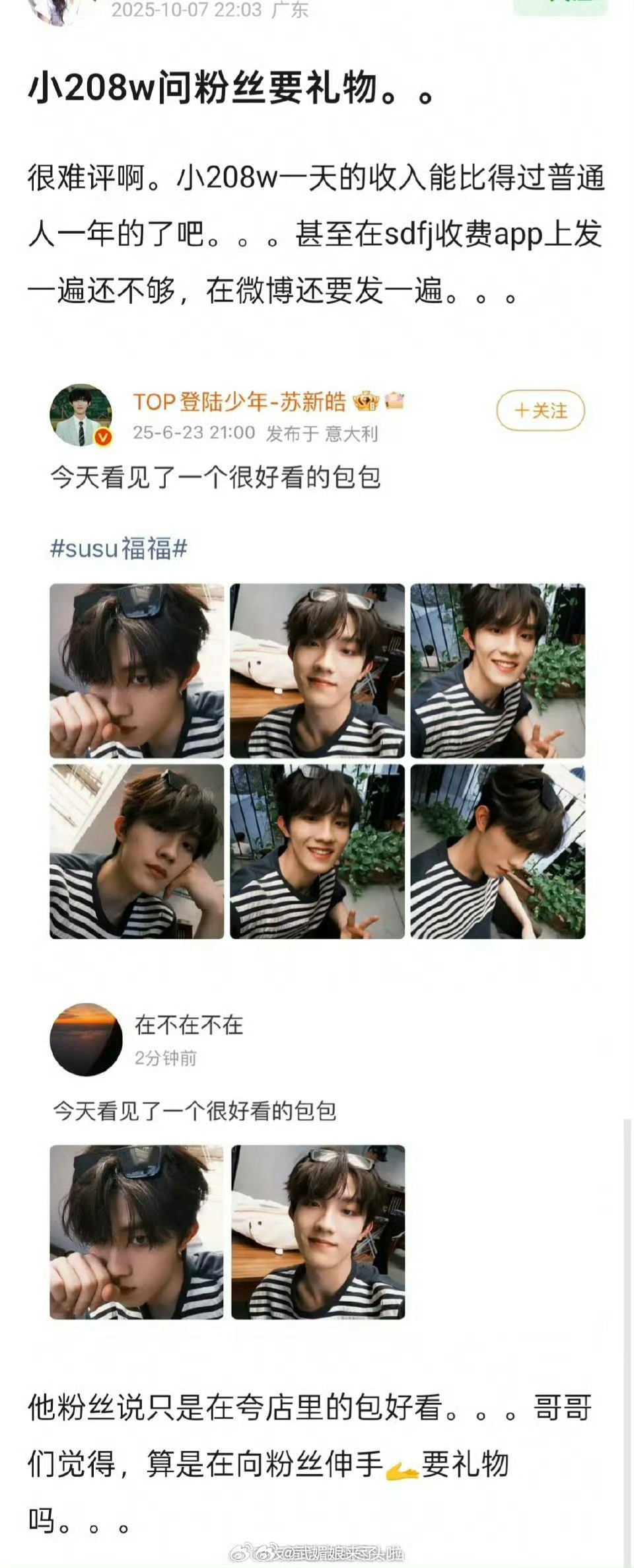 苏新皓六月在米兰时装周给品牌发的推广博。现在被人翻出来泼脏水说他在问粉丝要包,品