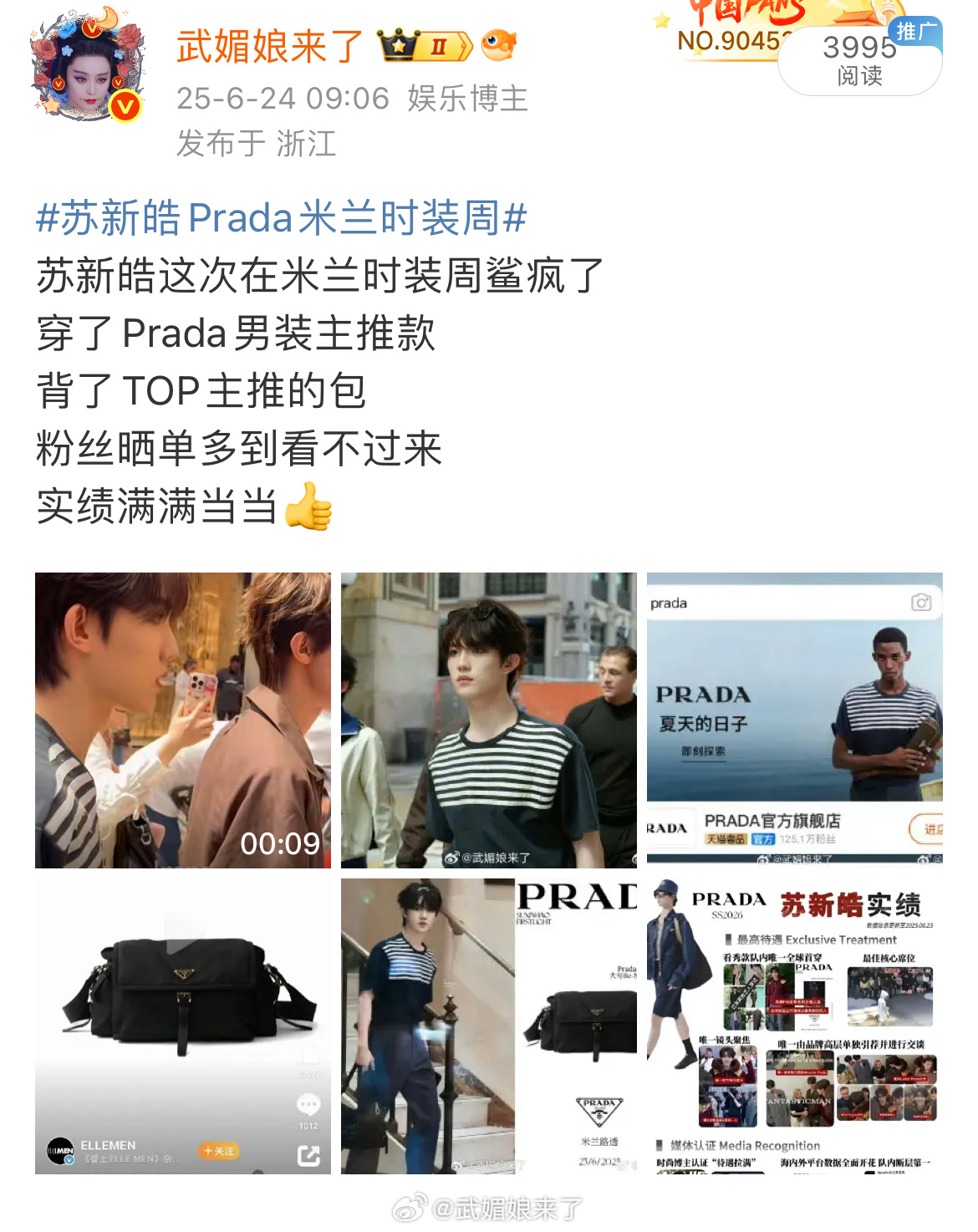 苏新皓六月在米兰时装周给品牌发的推广博。现在被人翻出来泼脏水说他在问粉丝要包,品牌给他高规格待遇他发个博夸一下不是很正常吗? 这也太尬黑了……