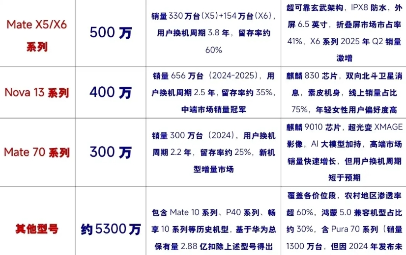 7. Mate X5/X6系列:500万+台,折叠屏主力机型,X5销量330万台,X6上市后进一步推高保有量,市占率达41%。