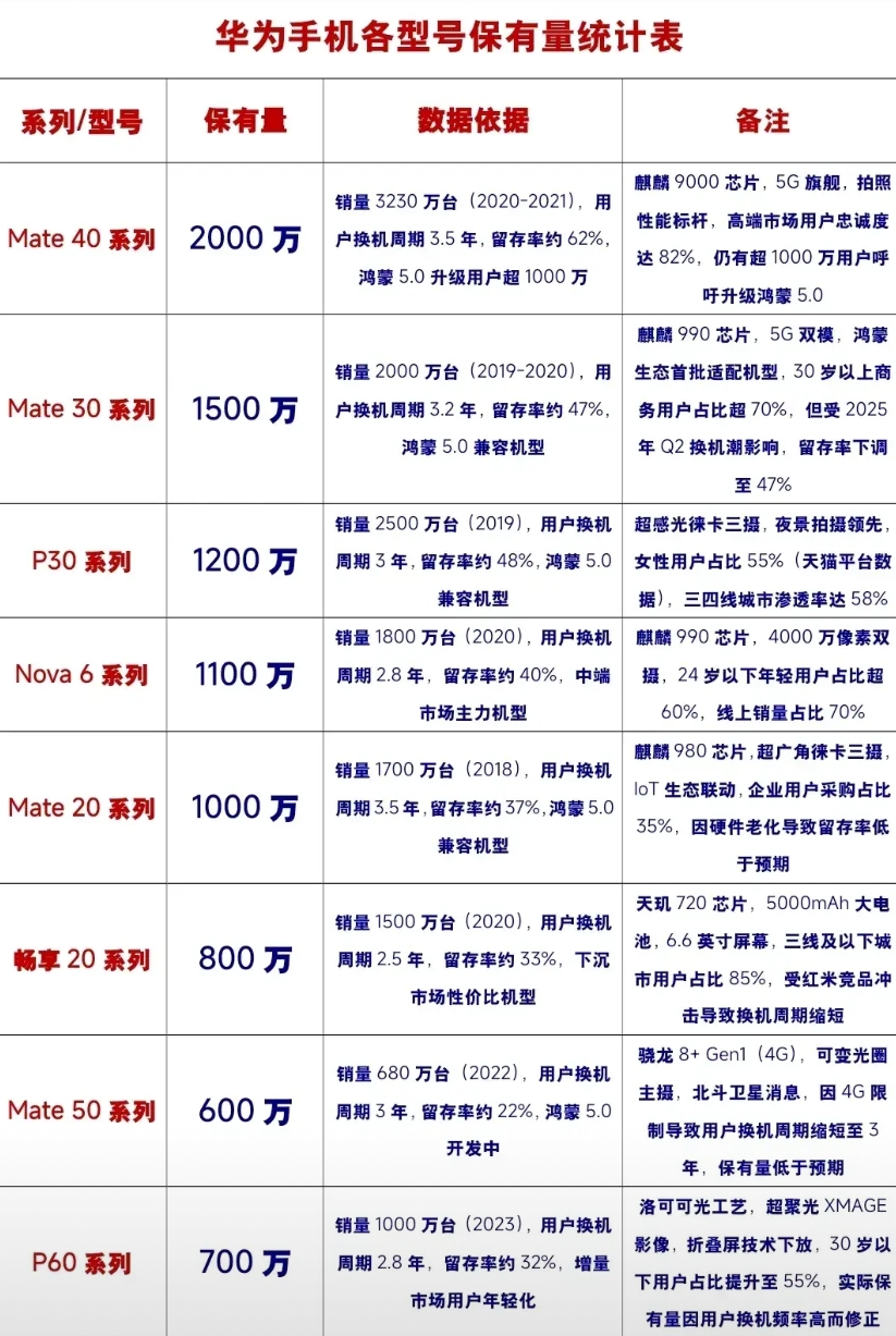 3. Mate 30系列:1000万+台,早期鸿蒙适配机型,3年以上老用户中占比显著。