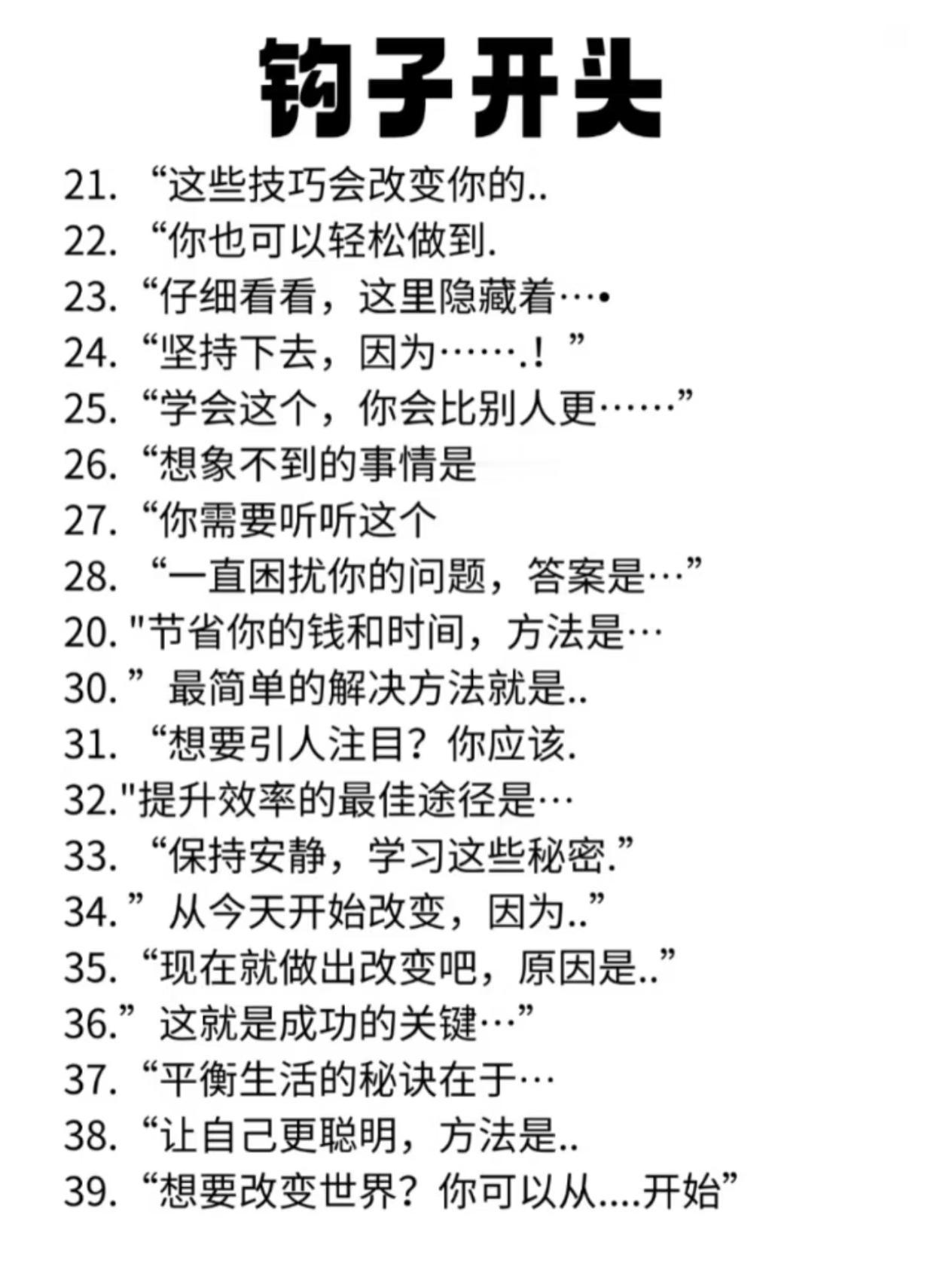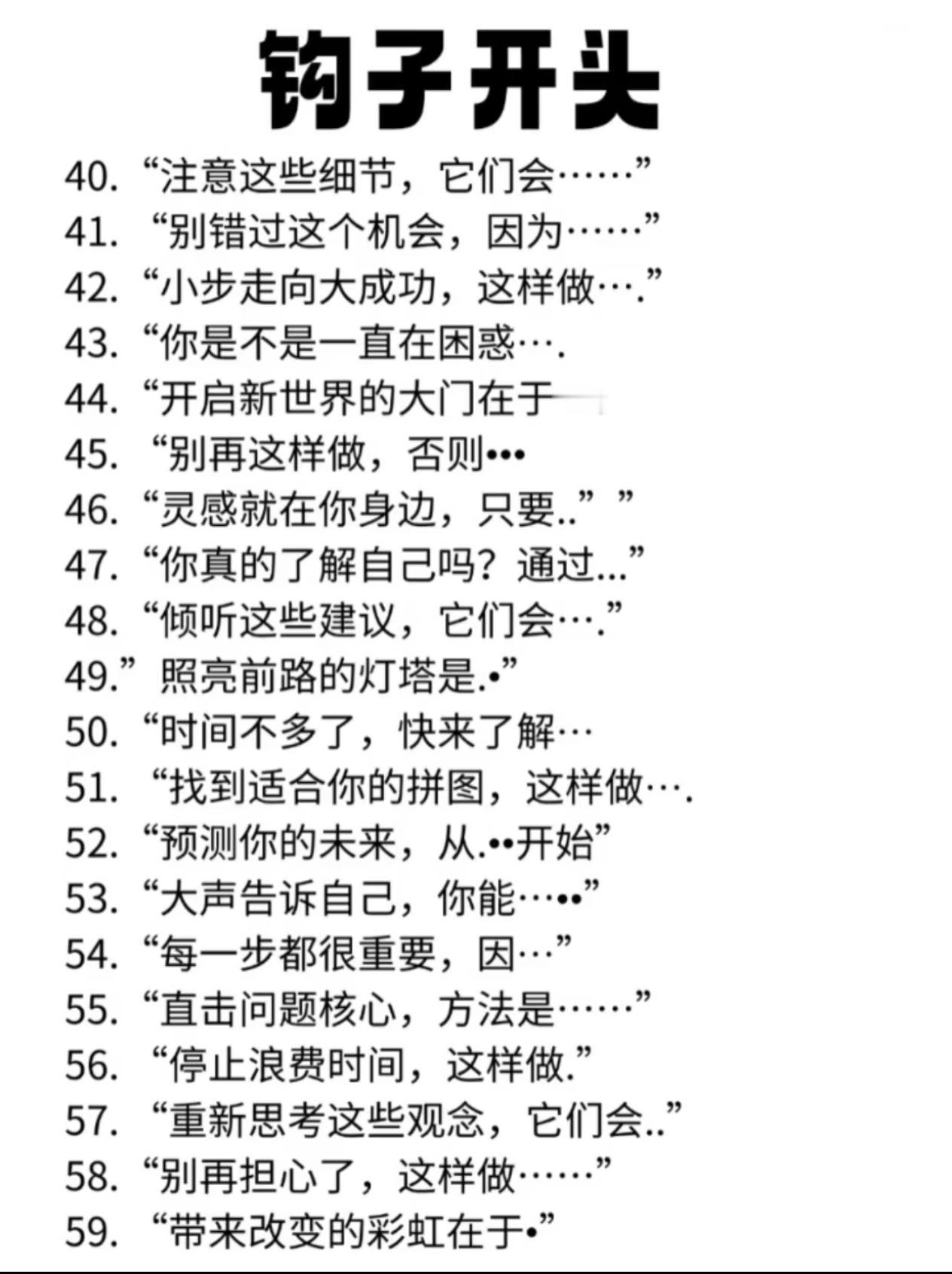 这些技巧也许会改变你的写作能力,为你的文章留下更多的读者。 如今信息爆炸时代,人们获取信息的方式多种多样,你信不信?开头没有吸引力文章,会丢掉潜在客户,如果有一个好的开头,能给自己的文章留下更多读者。 就比如现如今的小短剧,没有一个吸引人的开篇,留不住刷小视频的小手。 还有很多广告,都有一种莫名其妙的图片加文案,让自己情不自禁的点进去,当点进去才发现原来是广告。 所以说,文章的开头很重要,下面整理的59个写作钩子,相信对你以后的写作会有很大帮助。 整理不易,点赞收藏转发起来吧!
