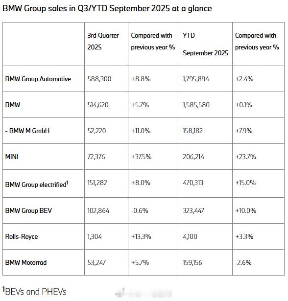 BMW品牌:第三季度交付 514,620辆,同比增长 5.7%。BMW M 高性能品牌前三季度累计交付 158,182辆,同比增长 7.9%
