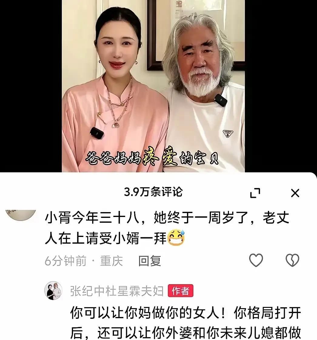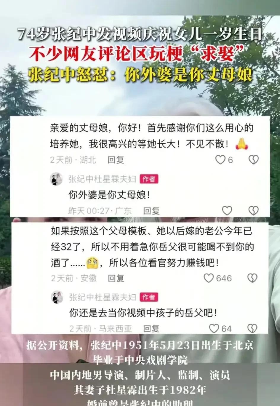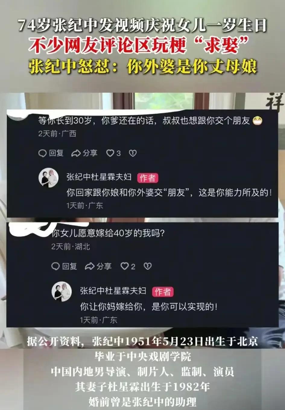 够恶狠!老头这是玩不起开始骂人了!你能74岁娶一个大31的,网友调侃一下你的女儿就这么气急败坏吗? 近日,媒体报道,著名导演张纪中,发布视频为1岁女儿庆生。 视频下面遭网友们玩梗调侃。 纷纷叫起老丈人,老岳父,称以后要娶张纪中的女儿。 要说这些网友们确实有点过火,毕竟人家女儿才1岁嘛。 不过,网友即便喊起老丈人,老岳父,那也是说以后的事,不是说现在就娶。 就算是有点儿过头,作为著名导演,公众人物,你自己把日常晒出来。 网友们评论一下,这样直接恶骂网友,有点忒过了吧? 再说了,这也只是网友们玩的一个梗,谁让你74岁娶了大31岁的呢? 人家只是喊你个老丈人,老岳父,你怎么就说人家的岳父岳母,是人家的外婆外公呢? 还说让人家娶自己的妈妈,娶自己的儿媳妇,这不是骂人家乱伦嘛! @猿方有看法 感觉这样好像确实是有点儿格局小了点,毕竟是公众娱乐人物嘛,这点玩笑都开不起? 况且网友又没有怎么样骂人,反倒是老爷子本主儿火力全开骂人了。 各位网友,怎么看呢?欢迎评论区留言讨论