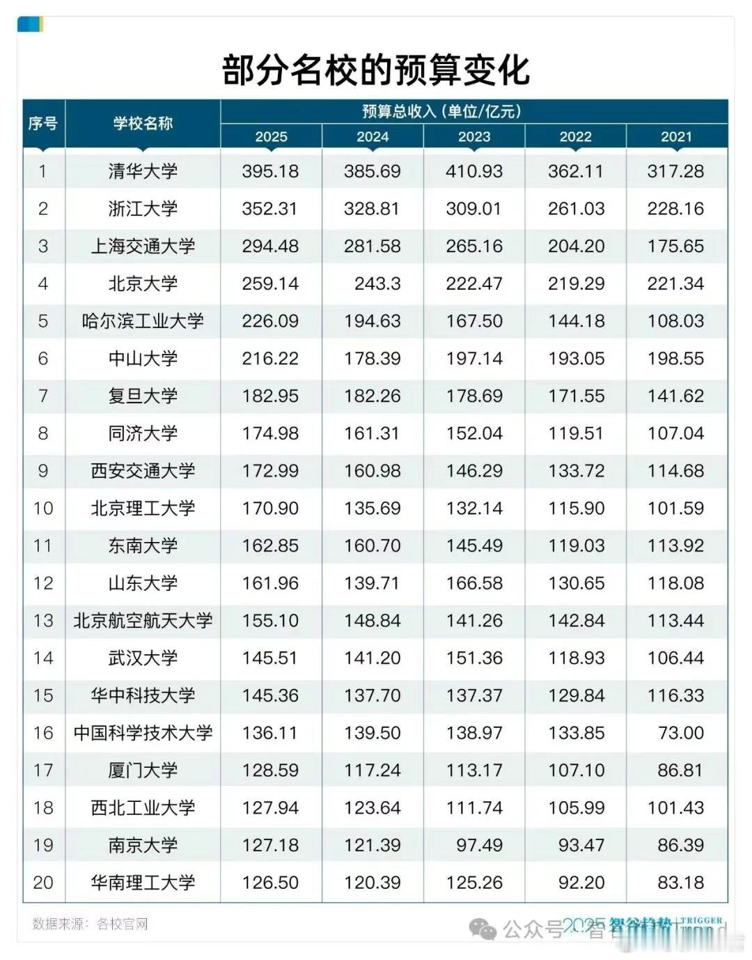 以“国防七子”为例,其中的哈尔滨工业大学、北京理工大学、北京航空航天大学、西北工业大学在这五年的预算经费均位于全国前二十。特别是哈尔滨工业大学,与2021年相比,增加了118.06亿元,增幅相当于一半,甚至比清华北大的增量还要多。
