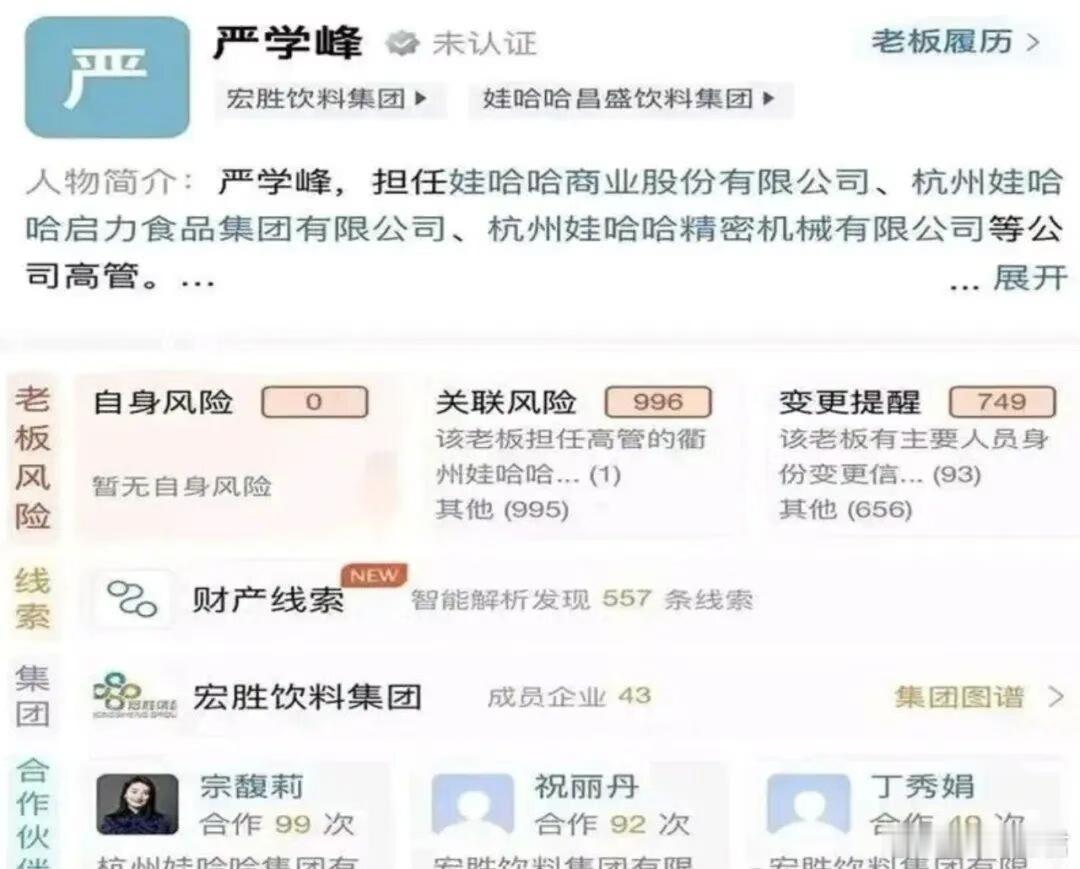 而查一下严学峰的个人财务线索你会发现,严学峰和宗馥莉的合作,已经达到了99次。可见这两人的业务合作关系,还是非常紧密的: