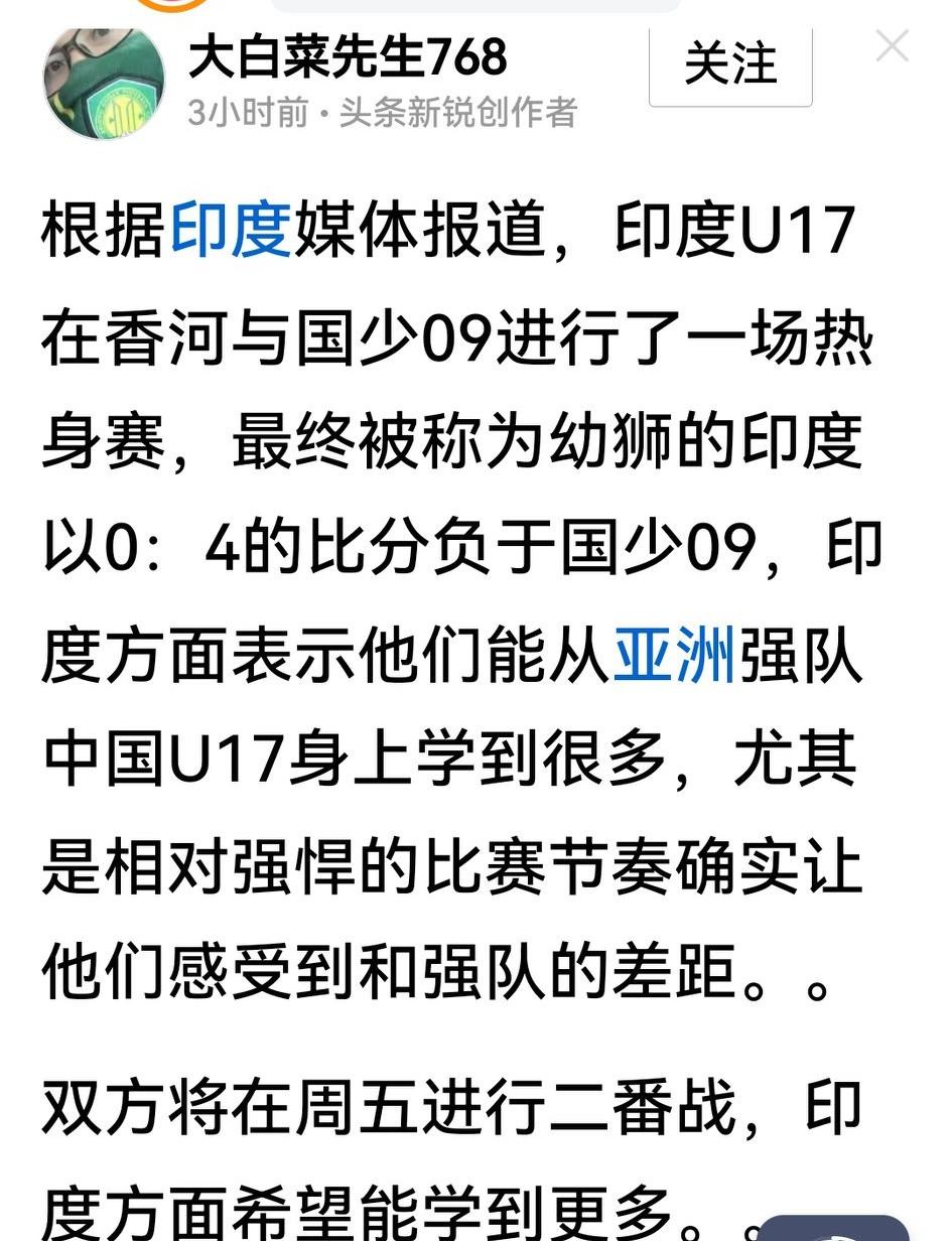 09段邀请印度U17来香河送菜,4:0的比分证明对手确实菜。但从来都高调的三哥媒体,罕见地低调说从中国U17身上学到很多,倒令人奇怪。 此前的内蒙兴泰杯和沈阳和平杯,与澳越日韩的比赛战绩让人开怀,人们对这支队伍当强队一般的存在。如今邀印度队来比赛,估计球迷也很奇怪。 这支队伍以亚洲对手为目标,可以理解,但集训中不敢邀更高水平的欧美强队来比赛, 仅在亚洲球队搞“内循环”,就这点视野,我也奇怪。