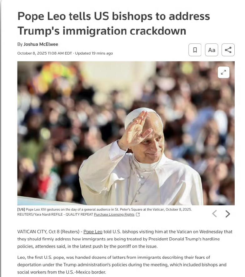 教皇利奥呼吁美国的主教们应对特朗普对移民的打压政策。 教宗利奥周三在梵蒂冈接见前来访问的美国主教时表示,他们应当坚决回应特朗普总统强硬的移民政策对移民造成的待遇问题。作为首位美国籍教宗,利奥在会面中收到来自移民的数十封信,这些信件描述了他们在特朗普政府政策下对被驱逐出境的恐惧。与会者包括来自美墨边境的主教和社会工作者。