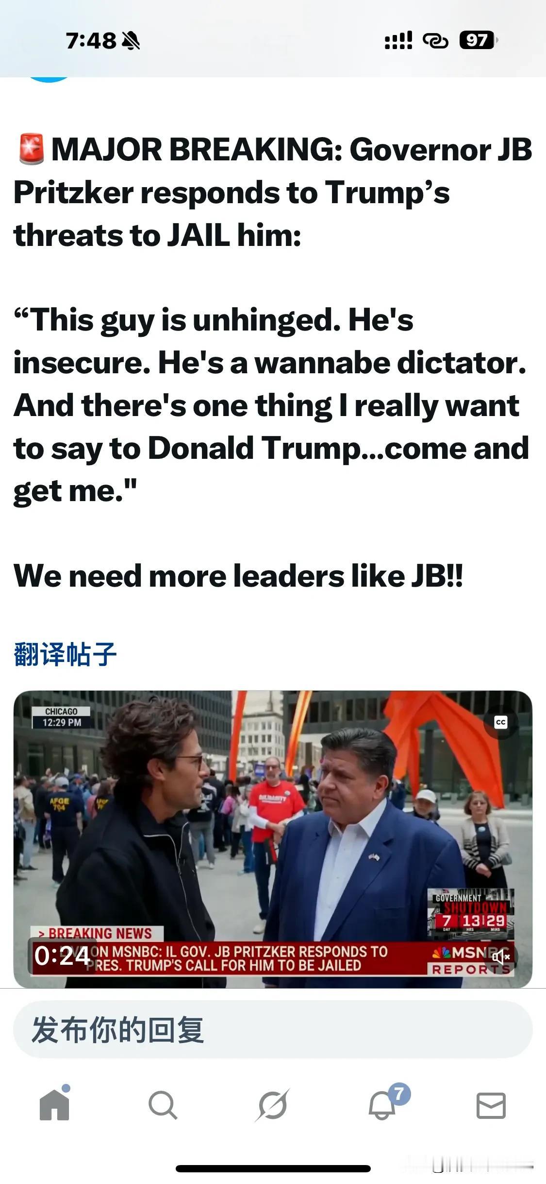 重大突发事件:州长JB普利兹克回应川普威胁要把他关进监狱: “这家伙精神失常,