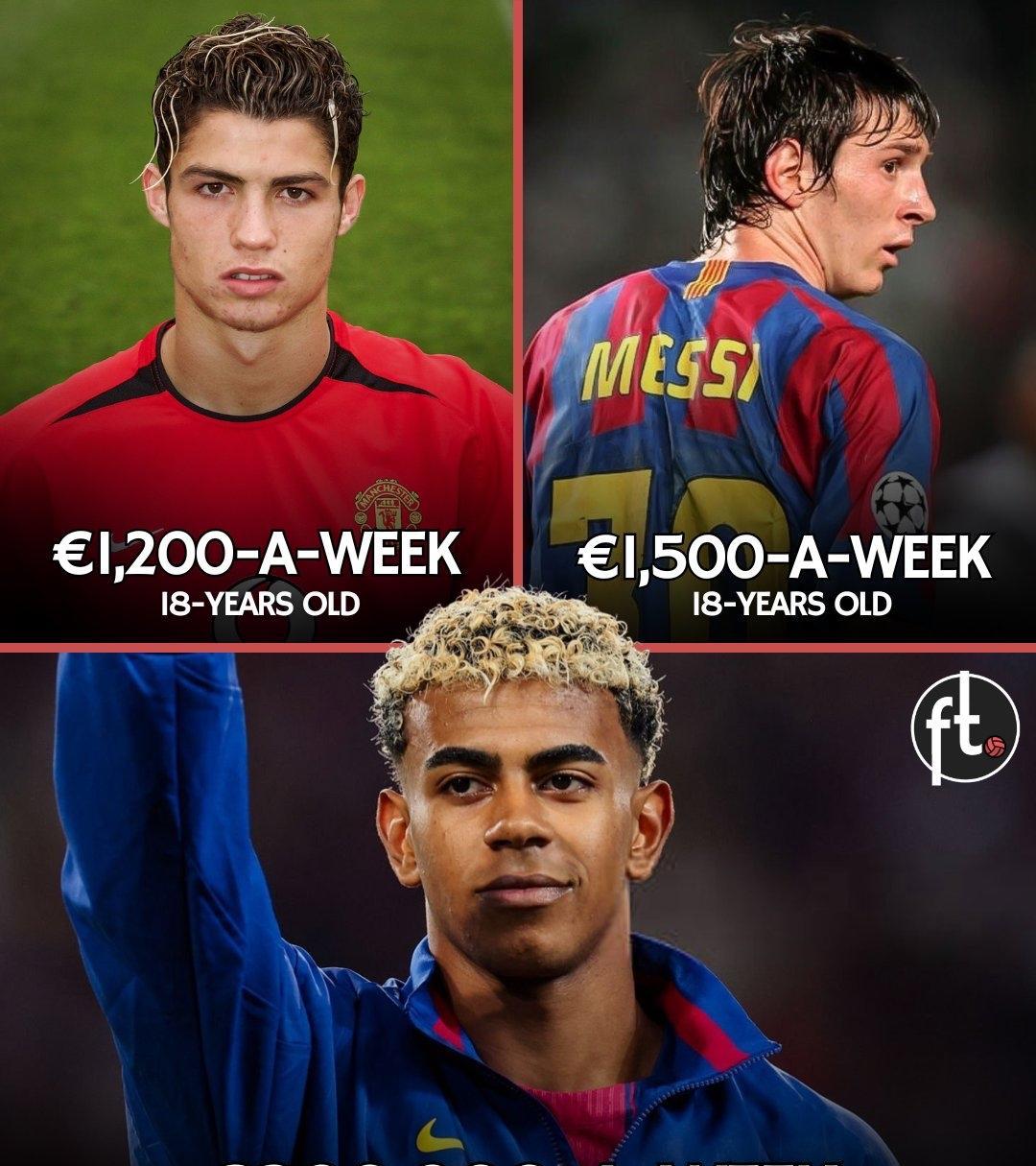 18岁时的C罗周薪是1200英镑。18岁时的梅西周薪是1500英镑。然而18岁的亚马尔周薪居然达到了30万英镑。 这说明了国际足坛的通货膨胀确实相当厉害。不过巴萨对于亚马尔的期待也非常高,看他接下来能否也拿一个金球奖了。