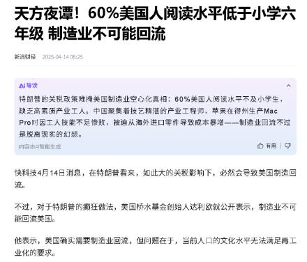 美国桥水基金创始人爆料,老美制造业无法回流不是因为受教育程度高,不愿意干!而是因为美国60%人口受教育程度低于小学六年级,干不了!精英永远在哪里都是少数啊! 这个数据或许超出很多人的认知,但现实案例早已给出印证。苹果公司曾雄心勃勃地在得克萨斯州生产Mac Pro,结果却陷入零部件供应和工人技能的双重困境,不仅要从海外进口大部分组件,本土招募的工人连基本的设备操作都难以掌握,最终导致交付延期、成本飙升。 无独有偶,富士康在威斯康星州的工厂招聘中,即便经过半年培训,美国工人的合格率还不到中国工人的三分之一,这样的劳动力素质差距,直接让制造业回流变成了纸上谈兵。 现代制造业早已不是流水线重复劳作的代名词,自动化设备、智能生产线的普及,要求工人必须具备基础的数理知识、读懂复杂操作手册的能力,以及快速学习新技能的素养。 就拿最简单的数控机床操作来说,工人需要理解机械图纸、输入编程指令、应对设备故障,这些都离不开小学以上的文化水平和逻辑思维能力。 而美国近六成成年人连小学六年级的阅读水平都达不到,意味着他们连设备安全须知都难以完全理解,更谈不上精准操作高精度仪器。 美银证券的报告就明确指出,合格工人不足是美国企业回流决策的重大障碍,目前美国制造业仅占整体就业比重的8%,即便新增产线也多趋向高度自动化,对就业市场的带动效应有限,这背后正是劳动力素质与产业需求的严重错配。 有人可能会质疑,难道不能通过培训弥补教育短板?但现实是企业根本承受不起如此高昂的培训成本。美国劳工统计局2024年的数据显示,学士学位持有者年薪中位数达80236美元,而低学历人群的收入水平根本无法支撑他们投入长期培训。 更关键的是,基础文化知识的缺失让培训效率极低,就像富士康案例中展现的,半年时间都难以达到基本合格标准,这对于追求效率的企业来说显然不现实。 反观制造业强国德国和日本,正是凭借完善的职业教育体系,培养出大量技术精湛的产业工人,为制造业发展奠定了坚实基础。 美国公共教育系统长期存在的资金短缺、教学质量不均等问题,导致年轻一代在关键技能培养上存在严重短板,形成了"教育不足-技能缺失-就业困难"的恶性循环。 制造业回流的困境还不止于劳动力素质,低教育水平带来的连锁反应正在层层传导。首先是成本问题,美国人工成本本身就处于全球高位,再加上企业需要额外投入巨额培训费用,使得本土制造的成本比中国高出15%以上。 现在,美国产品在质量和价格上都无法与中国竞争,客户根本不愿为"美国制造"支付溢价。 其次是供应链短缺问题,美国制造业空心化已持续数十年,从20世纪80年代起,经济重心就逐渐转向金融、科技等服务业,大量资本和人才流出制造业,导致本土产业链严重断层。 以电子产品制造为例,工业级电子元件供应严重不足,即便企业想回流,也难以在本土找到完整的零部件供应商,只能依赖进口,这又进一步推高了成本、延长了交货周期。 更值得深思的是,这种劳动力结构的失衡正在加剧美国社会的分化。 数据显示,美国约有890万美国人打多份工维持生计,其中一半拥有大学学位,这说明即便是受过高等教育的群体,也面临就业质量不高的问题,而低教育水平人群的就业选择更是局限于低薪服务业。 当制造业岗位因技能门槛无法被本土劳动力填补,企业要么选择继续外包,要么被迫接受低效生产,这两种结果都不利于美国经济的长远发展。 达利欧所说的"精英永远是少数"确实切中要害,美国社会过度依赖精英阶层推动科技创新,却忽视了基础劳动力素质的提升,导致产业结构出现严重断层。 制造业回流不仅需要政策引导,更需要从教育改革、职业培训等根基性问题入手,否则再高的关税壁垒、再优惠的补贴政策,也无法弥补劳动力素质带来的硬伤。 美国制造业回流的困境,本质上也是一次对社会基础能力的考验。当政策制定者沉迷于贸易战和关税手段时,却忽视了最核心的劳动力素质问题。 那些认为只要抬高贸易壁垒就能让制造业回归的想法,就像认为躲进浴缸就能抵御核弹一样不切实际。 真正的解决方案,需要正视达利欧指出的教育短板,投入资源改善公共教育和职业培训体系,让更多人具备适应现代制造业的基本能力,否则制造业回流永远只能是政治口号,而非经济现实。