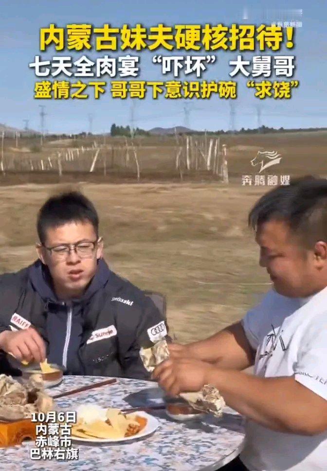 10月6日在内蒙古赤峰,山西大舅哥去看望远嫁的妹妹,被妹夫硬核招待了一把。这妹夫直接安排了7天全肉宴,把大舅哥吃得连连护碗拒绝。刚到那天的接风宴,整只烤全羊就把大舅哥震住了,妹夫分肉,那外皮酥得掉渣,香得他直拍大腿。 接下来几天,从羊杂汤配肉包子到烤羊腿配肉肠血肠,各种羊肉美食不断。到第五天,大舅哥感冒都好了,可看见肉还是怕了。不过妹夫说这是团结肉,必须吃。最后大舅哥还打包了两斤风干肉。网友说看他俩穿的衣服就知道不是一个级别,这草原式宠爱,谁能拒绝啊!