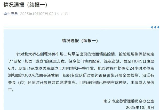 【南宁再通报出现地面塌陷:完成渗透点周边土方回填平整作业,无伤亡】广西南宁市应急管理委员会办公室10月9日发布情况通报(续报一),全文如下:针对北大桥右侧堤外停车场二坑泵站出现的地面塌陷险情,抢险现场指挥部制定了"封堵+加固+巡查"的处置方案。经多部门协同配合、连夜奋战,截至10月9日凌晨6时,现场已完成渗透点周边土方回填和平整作业。抢险过程严格落实24小时水位监测和周边300米范围交通管制,组织专业队伍对周边设备设施开展全面检修,沿江有关县(市)区同时开展拉网式巡堤排查。目前该险情已得到有效控制,未造成人员伤亡。 此前,南宁市应急管理委员会办公室通报称,2025年10月8日19时50分,南宁市应急指挥部通过监控发现:南宁市北大桥右侧堤外停车场二坑泵站有一陷坑。发现险情后,市应急指挥部立即报告并调度中国安能一局等抢险力量赶赴现场处置。