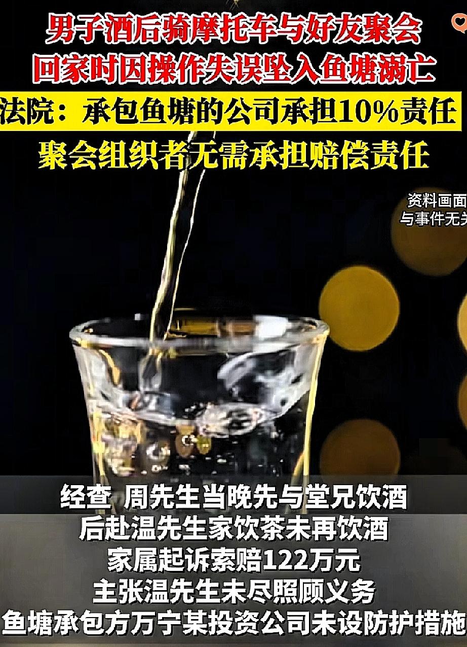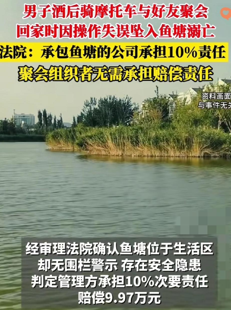 酒后溺亡索赔123万!法院判决撕开“谁死谁有理”的误区 35岁男子酒后骑摩托找朋友,隔天溺亡鱼塘,家属索赔123万,这事真给所有人提了醒。 别以为出了事就能找旁人兜底,法律早把责任分清楚了。 周某作为成年人,明知喝酒还骑摩托,自身肯定要负主要责任,这是法院判案的核心逻辑。 首先得明确,成年人该为自己的行为买单。明知喝酒后危险,还去鱼塘边活动,自身肯定要负主要责任。 再看朋友,不是所有同饮者都要担责。只要没劝酒、没放任其独自陷入危险,大多不用赔钱 。 但组织者若没尽到提醒义务,可能要担点责 。法院也常判这类案件中,死者承担核心责任 。 朋友没劝酒、也没放任他陷入危险,最终被判无责,这很合理。 毕竟同饮者的义务不是无限的,不能啥锅都往他们身上甩。 鱼塘主因为没设护栏和警示标,确实有过错,但也只担了10%责任,赔了不到10万。 索赔是家属的权利,但责任划分得讲依据,不是喊价多少就该给多少。 “死者为大”不能变成“死者全对”,成年人得为自己的选择负责。 你们觉得这判决公平吗?换成你会怎么看?