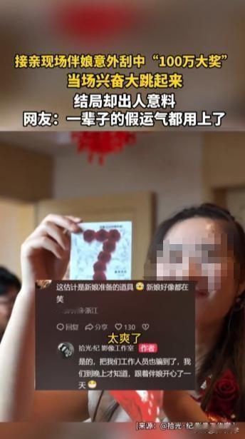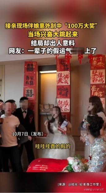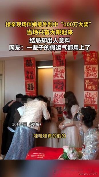 我的天啊!天上掉馅饼了?!接亲现场居然刮出 100 万?!10 月 7 日河北那场婚礼,直接把 “天上掉馅饼” 演活了! 红绸挂着喜字,屋里满是起哄声,新娘突然递了张刮刮乐给伴娘:“活跃下气氛,试试手气!” 伴娘笑着接过来,指尖蹭开银色涂层时还在打趣 “中五块都赚了”,可越刮眼睛越直 —— 最后几个数字露出来,居然是 “100 万”! 她攥着卡片手都抖了,凑到窗边反复对光看,又扒着手机查中奖规则,确认三遍后突然跳起来,伴娘裙的裙摆都飞起来了:“真中了!100 万啊太爽了!” 还举着卡片凑到婚庆摄像机前,笑到嘴角快咧到耳根。 可镜头扫到床上的新娘时,网友瞬间看出不对劲 —— 新娘捂着嘴笑,眼神里全是 “看戏” 的意味!原来这张 “刮刮乐” 根本是新娘买的整蛊道具,不管怎么刮都是 “100 万”,压根没法兑奖! 连婚庆团队都被这逼真的道具骗了,直到晚上才知道是场乌龙。网友评论快笑疯了:“伴娘这一辈子的假运气全用在这了”“新娘那笑一看就有猫腻,藏得也太深了!” 其实新娘就是想给接亲添点乐子,不过也得提醒大家:真遇到 “天降大奖”,先别急着蹦,确认下道具和真奖的区别才好! 要是你在接亲现场刮出 “100 万”,第一反应会是啥?会不会也像这位伴娘一样激动到跳起来?评论区说说~