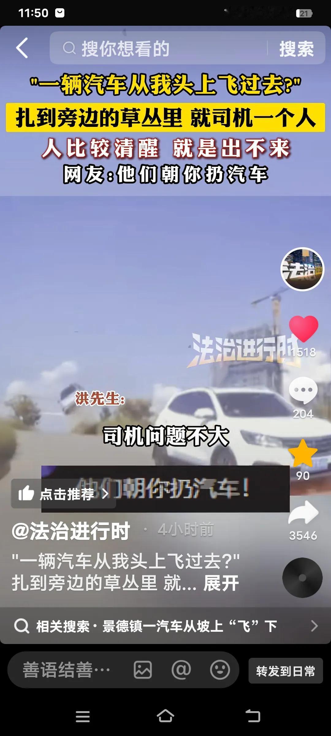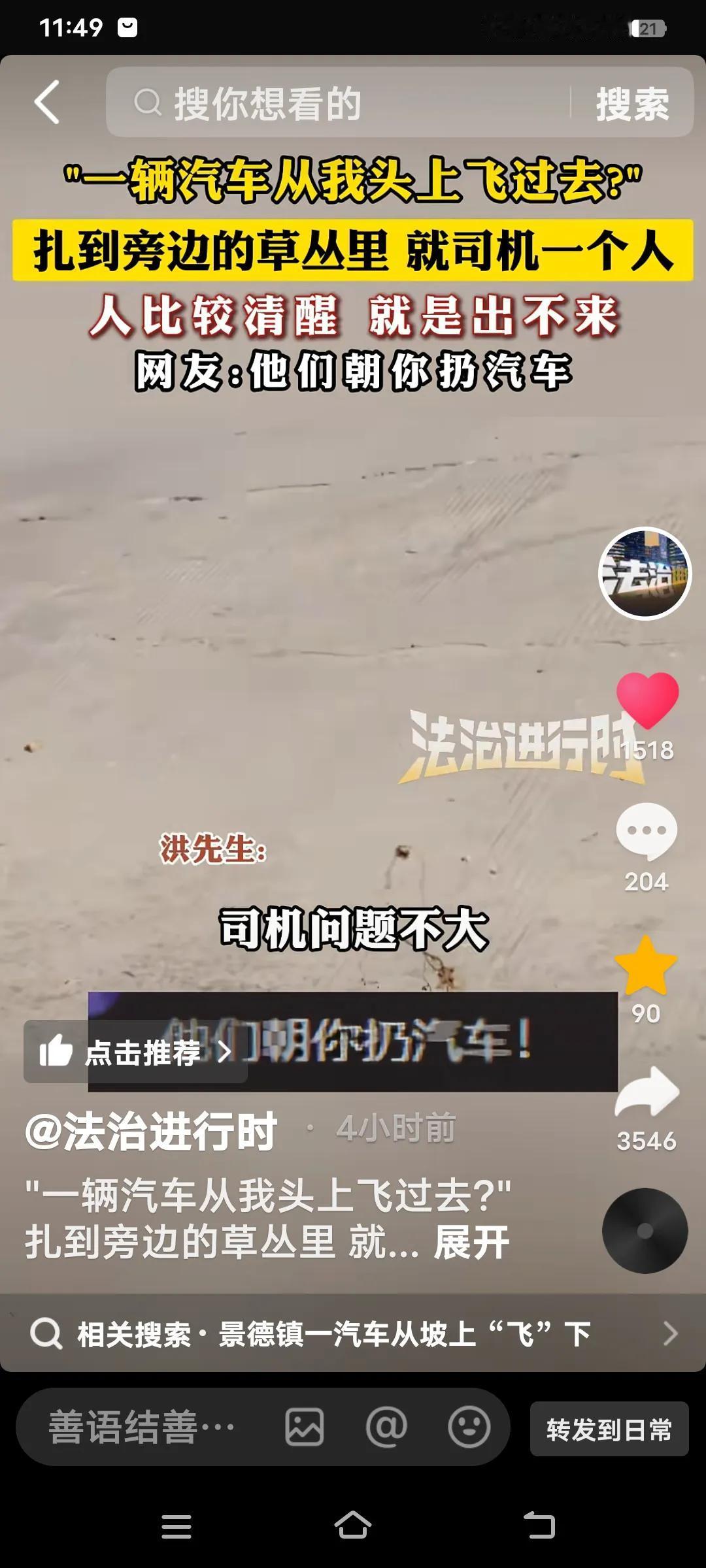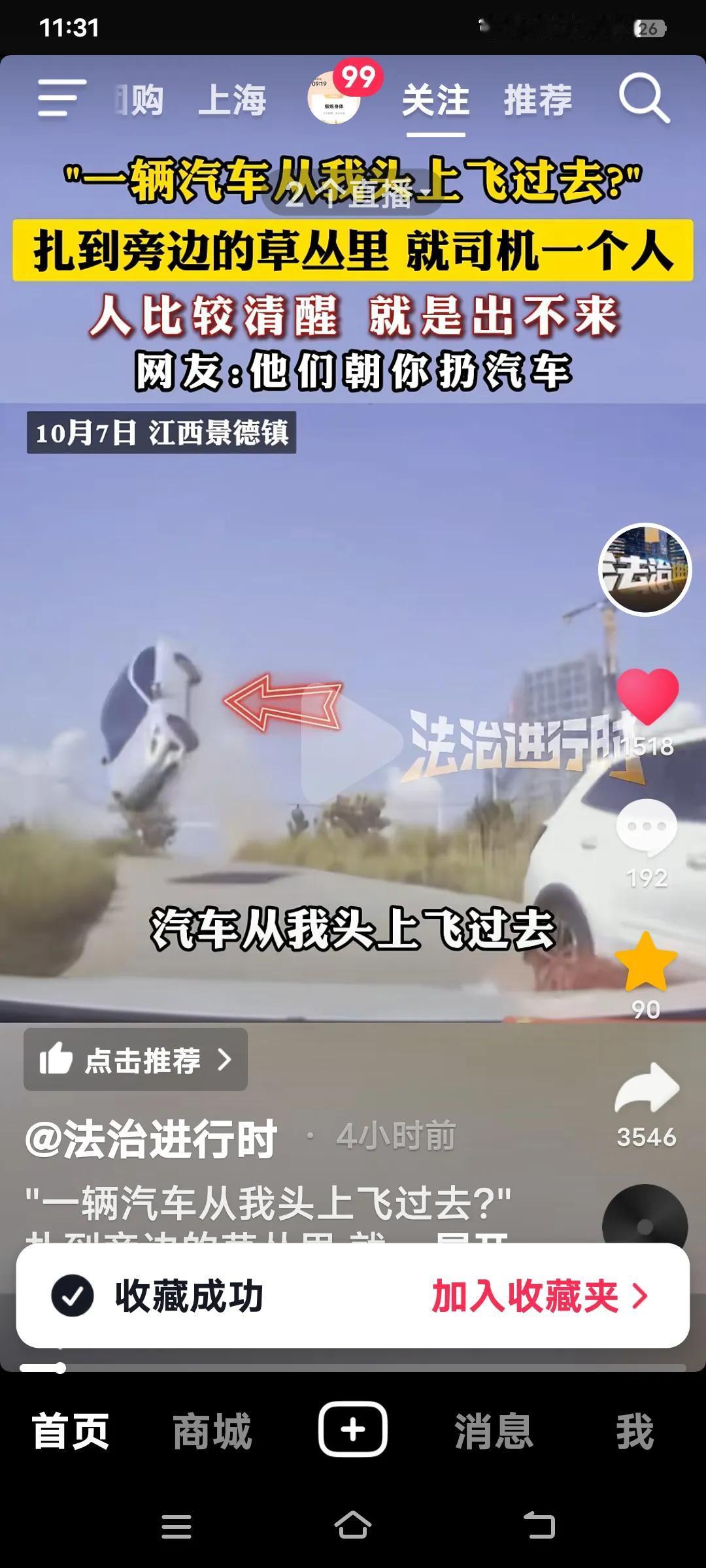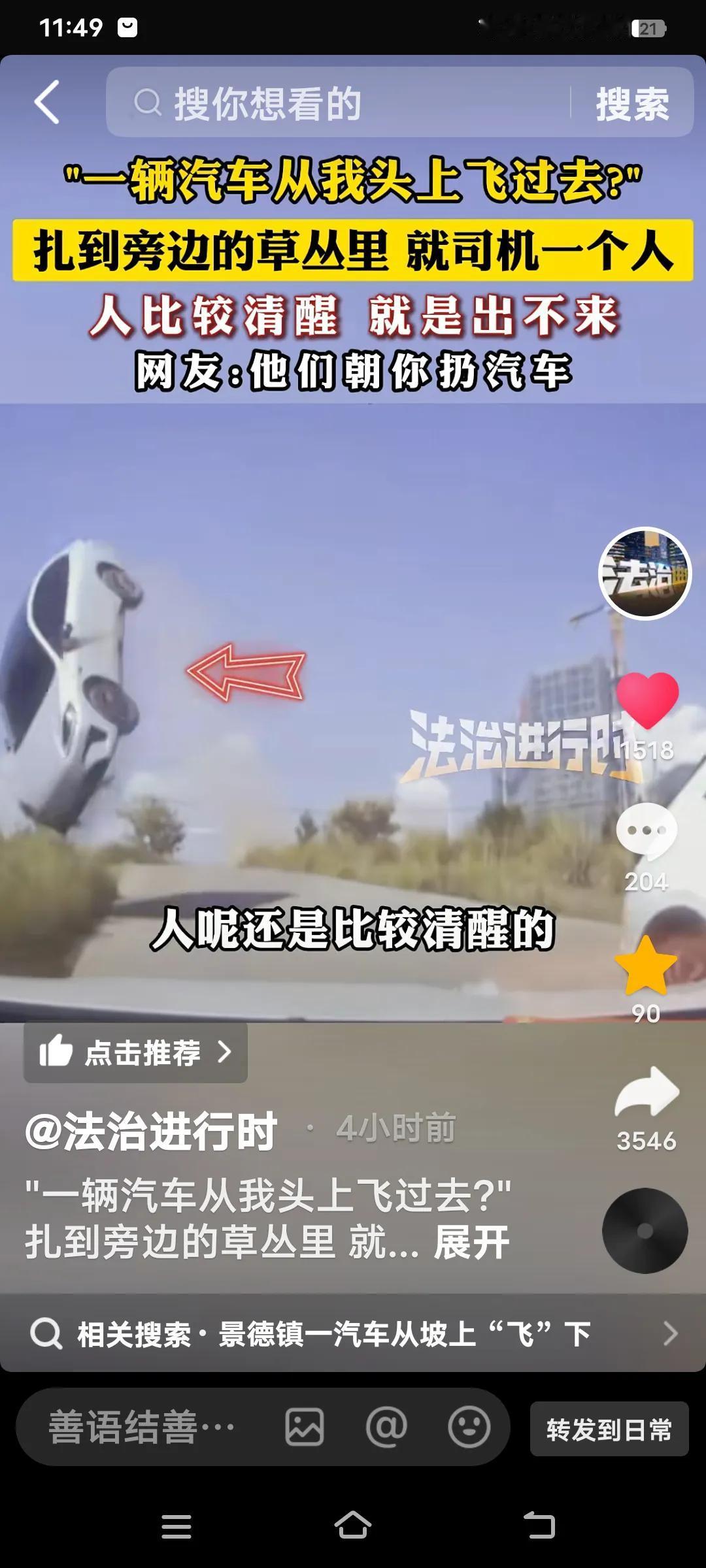 真是令人震惊的一幕!“一辆汽车从我头上飞过去了”。最终,汽车扎进了草丛里,只有司
