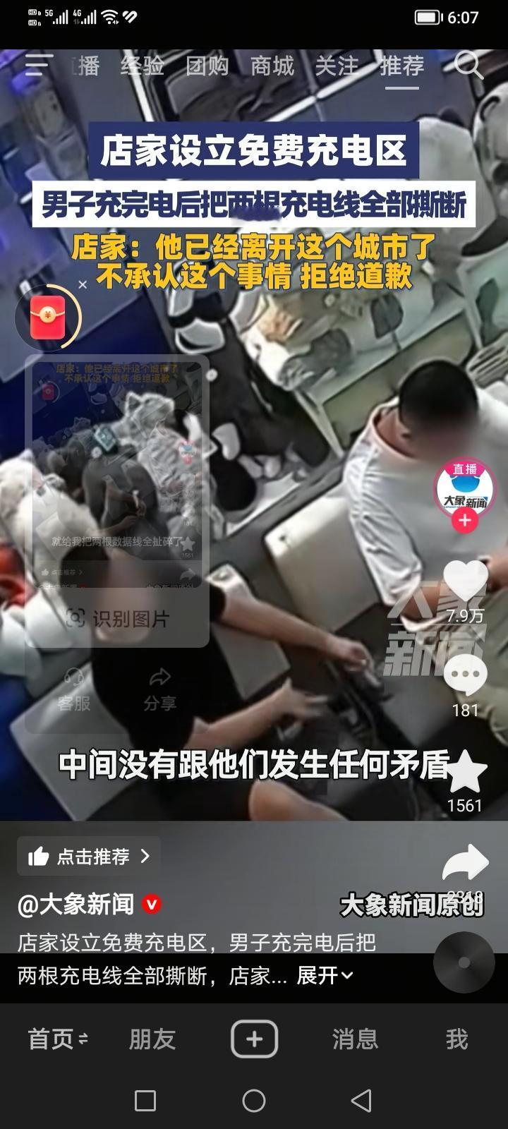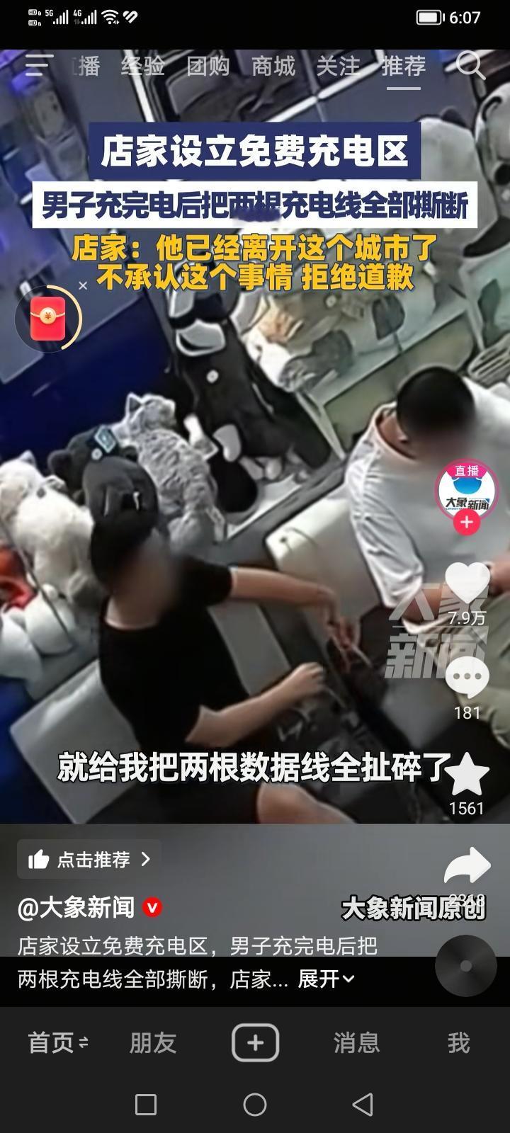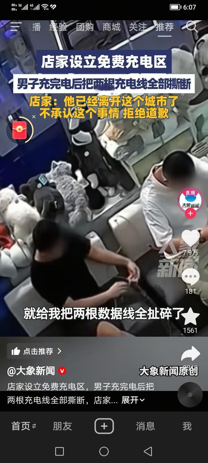 现在很多人的素质真的是非常低了。10月4日中午,两男两女走进山东烟台万达附近一家手机店,称手机没电想借充电线,店主石先生指了指免费充电线的位置后便转身进了里屋。 半小时后,石先生出来发现两根数据线被扯断,铜丝外露,沙发缝里还嵌着一块口香糖。监控显示,黑衣男子先观察四周,确认老板不在后,用力拽线并将其扯断,同行的白衣女子则在起身时把口香糖塞进了沙发缝里,另外两人坐在一旁看着,甚至还轻笑了几声,全程无人制止。 石先生当场报警,警方查到黑衣男子是外地人,来自哈尔滨,人已不在烟台。石先生打电话给黑衣男子,刚提到“数据线”,男子便称打错了并挂断电话,再打已被拉黑。警方表示,由于损坏物品价值较低,案件尚不构成刑事立案标准,但可以走行政程序处理,目前相关材料已在移交中。 后来,另一名白衣男子主动联系石先生,称当时石先生开门时推凳子的声音大了点,吓到了黑衣男,后者可能因此心生不满才扯断数据线,但石先生并不认可这一说法。石先生表示自己并不在意赔偿,只想要一句道歉,但至今无人回应。低素质人群 低素质人 无素质人 无素质的城市人 低素质游客