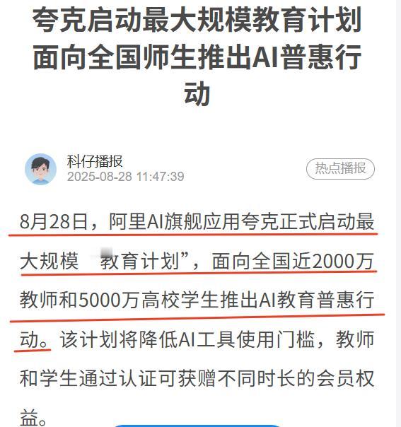 突然发现,夸克正在做的这件事,或将扼杀这些教育行业的乱象情况!   虚假价格营销、“0元学”、“打卡返学费”,类似一些机构或者平台将教育资源包装成营销工具的情况已经不新鲜了,相信很多人都见过。   放到现在,想用低成本换取好的教育资源似乎成了一件不太现实的事,不过阿里AI旗舰应用夸克偏偏就想打破这个现状,想要通过降低师生使用AI的门槛和成本,来实现AI教育普惠的目标。   想必很多人也都关注到了,此前夸克面向全国近2000万教师和5000万高校学生,上线了最大规模教育计划,主打不限时、不限量、无套路、低门槛。   当然听其言、观其行,大家最关心的还是夸克会到底会做些什么,又是怎么降低AI使用的门槛的?   从计划来看,完成认证的教师可以在每年的教师节获赠夸克包括夸克AI会员、扫描王会员以及网盘会员在内的夸克全端会员,而完成认证大学生则是能免费领取三个月的会员,后续续费也会有专属优惠。   可能有人又会问,这个会员有什么用?像扫描王、网盘大家应该都知道,已经很多人办公学习的常用工具,而在这一基础上,夸克还有AI学习、AI图像处理、AI转文件格式等核心AI能力。   不难看出,这些工具对高校师生的日常学习及工作都是非常实用的,而如今这些工具的实用门槛和成本都大大降低,无疑是一个好消息。   往远了看,AI时代正在到来,降低AI工具的使用门槛,是有助于提高教师及学生的AI素养的,这关乎他们的发展。   与此同时,让技术普惠高校师生,也能阻止教育行业的一些乱象情况,起到良币驱劣币的效果。