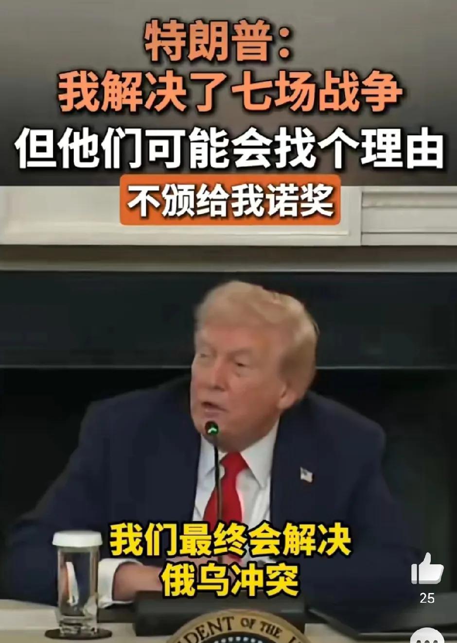 第一次看到特朗普如此不自信。 有记者问他是否会得到今年的诺贝尔和平奖,特朗普表示:这件事我做不了主。 老特说:尽管我解决了七场战争,而且第八场战争已经接近解决。历史上没有哪个人像我这样解决掉如此多的战争。但是我感觉他们可以随便找个理由就不把诺贝尔奖给我。 话虽如此,程序上还是要走走的。我想问一下老特,你说自己解决掉了七场战争,为什么我穷尽所想,也想不出有哪七场战争是你解决的?你能不能将这些由你解决掉的战争列举出来,让我长长见识,同时也让诺贝尔评奖委员会的那些人无话可说,觉得不把和平奖颁给你他们都不好意思? 除了以色列和伊朗、以色列和哈马斯、巴基斯坦和印度,还有四场战争呢? 难道是以色列和也门、以色列和阿联酋、以色列和卡塔尔、以色列和沙特之间发生的这些“战争”吗?如果这样算也行,只要你需要,就可以让以色列向其他国家刷导弹,想要多少场战争都可以。