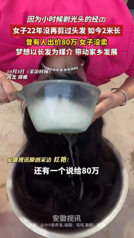 活久见!河北邯郸,一女子小时候因头发里有虱子被人嘲笑,长大后22年没有理过发,如今头发长达2米,有人出80万的价格想要收购被拒绝!女子表示她每次梳头要花1个小时,洗头至少40分钟。网友:不懂得见好就收! 据文登融媒10月8日报道,樊女士小时候,她的头发曾经因为有过虱子而被同学们嘲笑,孩子们的嘴巴总是那么直接,嘲弄的声音让她很受伤。 正是那时,她决定不再在意别人的眼光,也许正是这种不屈不挠的性格成就了她如今的长发,在许多人都急于剪掉头发,追逐时尚潮流的今天,樊女士却走了一条与常规不同的路,选择坚持留长发,甚至成为了河北小城的“长发女王”。 这份坚持,不仅仅是在发型上的选择,更像是她生活中的一种态度,22年间,她从未让自己的头发受损,依靠细心的护理和规律的保养,才换来了如今2米长的美发。 然而长发并不代表一切都轻松,每次梳理长发,樊女士需要花费一个小时,洗发时更是要专门抽出40分钟。 他常常发现,外出时连风吹过发梢的感觉都不太好,走在街头,长发像瀑布一样随风飘扬,成为了她的“标志”。 近年来,有不少人想要购买她的头发,出价从30万到80万不等,想法和动机各异,有人希望将这头长发用于制作假发,有人认为长发本身就有着极高的艺术价值。 面对这些高价收购,樊女士并未动摇,她清楚地知道,自己的一头秀发不仅仅是一个物件,它是自己多年来辛勤付出的结果,80万的价格也无法换回她对这头长发的感情。 对樊女士来说,长发不仅仅是一种外表的装饰,它还承载着她的梦想,她希望通过自己的长发,能够吸引更多人关注她的家乡,激发大家对传统美丽的认同感。 她甚至希望通过自己为表率,带动更多人开始留长发,既能够让家乡的传统文化得到传承,也能通过出售头发的方式让大家获得经济收益。 她的目标远不止是拥有长发,而是让这种长发成为一种象征,让更多人从她的故事中汲取到坚持与努力的力量。 当然,长发给她的生活带来了不少困扰,每天洗头、梳发的时间很长,有时也会感到烦躁,特别是在工作繁忙的日子里,时间变得愈加紧张,照顾长发的成本逐渐增大。 樊女士也意识到,过多的关注长发可能会影响到自己生活中的其他方面,但她并没有选择放弃,依旧坚持着这种方式,也让自己保持着对生活的热情和坚持。 樊女士的故事,其实也反映了一个社会现象,现代社会追求快速、便利,很多人都希望通过最短的时间获得最大化的效果,连发型都不例外。 而樊女士却以她的坚持与坚守,告诉我们,有时候,慢下来,注重每个细节,反而能够收获更多的美好。 有人说:“不懂得见好就收。”或许对一些人来说,卖掉长发换取一笔可观的收入,是一个不错的选择。但对樊女士来说,这个“好”不是一时的金钱,而是她付出的努力与坚持带来的价值,是真正属于她自己的美丽。 对于这件事情,大家有什么看法? 信息来源:《女子22年不剪发长至2米》安徽视讯