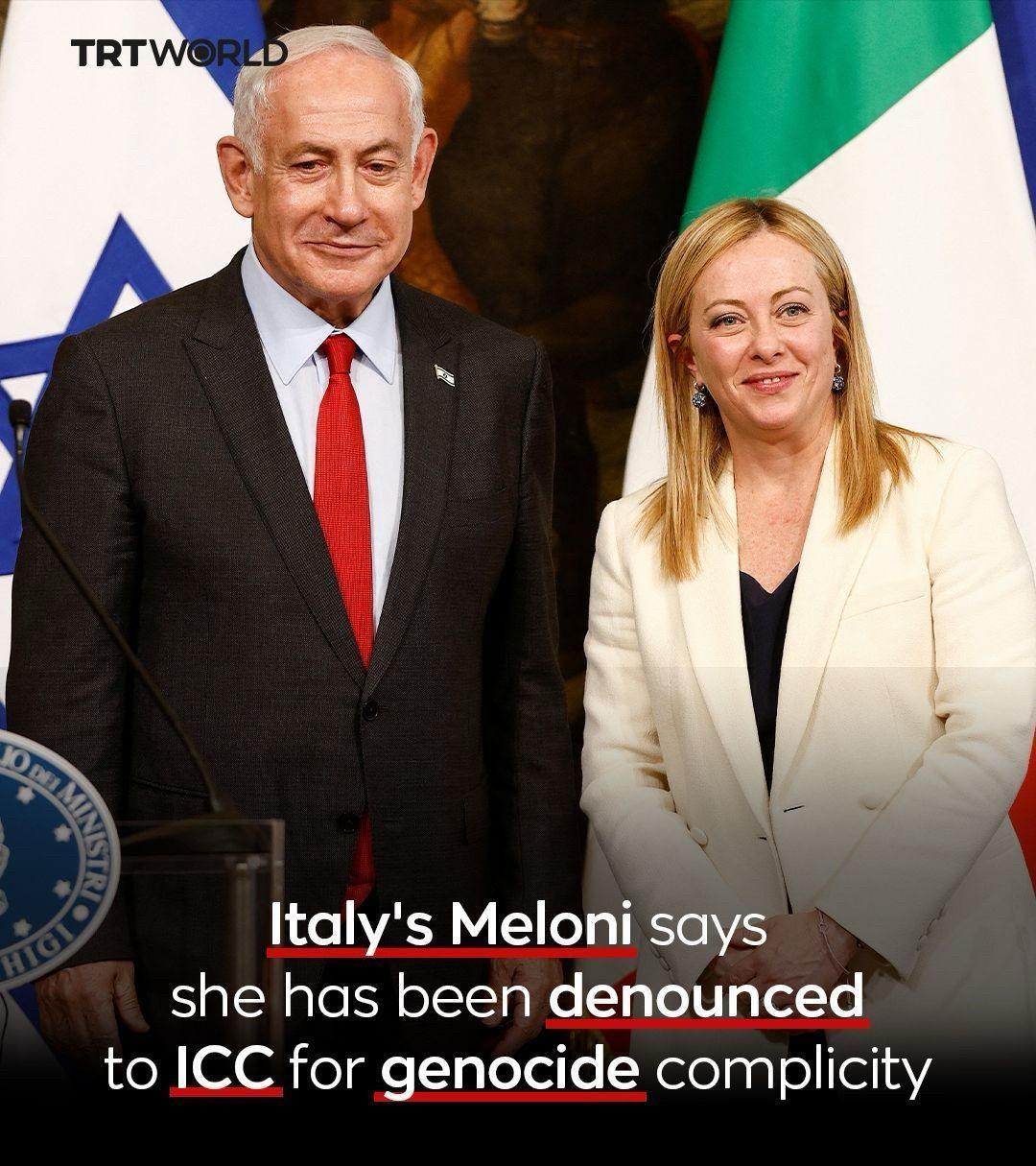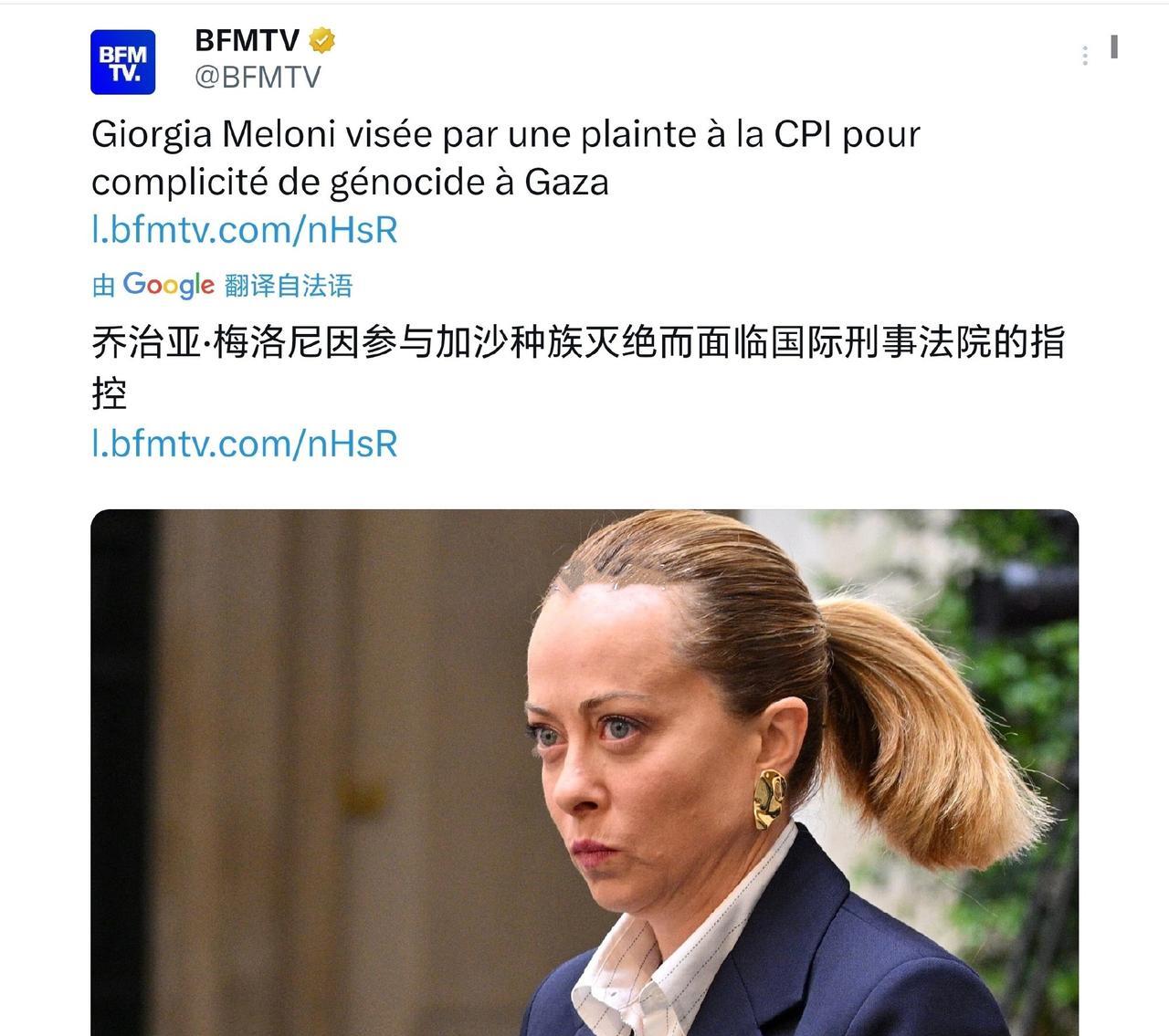 意大利的小甜甜这下麻烦大了,鉴于这个女人无下限地支持着以色列对加沙实施的战争罪以及种族灭绝,国际刑事法院(ICC)接到了举报并立了案。 案由就是“涉嫌参与和以色列的加沙战争有关的种族灭绝”。 与她一同被告的还包括国防部长克罗塞托和外交部长塔亚尼,而据梅洛尼自己的表示,航空航天与国防集团莱昂纳多公司的总经理罗伯托·辛戈拉尼也受到了指控。 该指控是由一个名为“巴勒斯坦法律工作者和律师”的团体起草,获得约五十人签署,其中包括法学教授、律师以及多名公众人物。 指控书内容原文:“意大利政府通过支持以色列政府,特别是提供致命武器,已成为正在发生的种族灭绝以及针对巴勒斯坦人民犯下的极其严重的战争罪和危害人类罪的帮凶。” 这下看梅洛尼如何应对了。