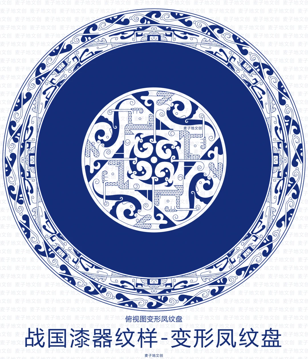 🐦🔥彩绘凤纹盘是战国时期漆器,1982年出土于江陵马山1号墓,现藏于荆州博物馆。该盘口径27.1厘米,高5.1厘米,采用夹丝胎制成,器型为敞口、宽折沿、斜折腹、圜底结构,通体髹黑漆。器物纹饰以暗红和朱红彩绘制:口沿内外侧饰变形鸟纹与卷云纹,口沿外缘绘卷云纹。内底中心短尾风外围环绕四组长尾凤纹,配合卷云纹与圆圈纹构成主体图案,内外圈纹饰通过四个勾连云纹形成整体布局。