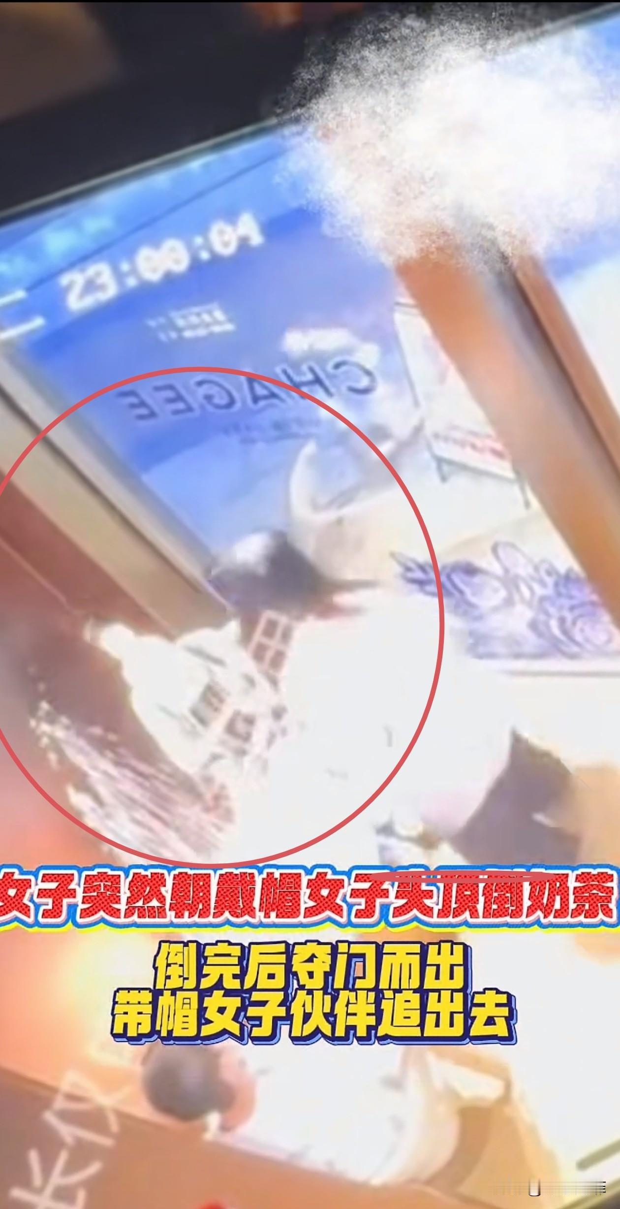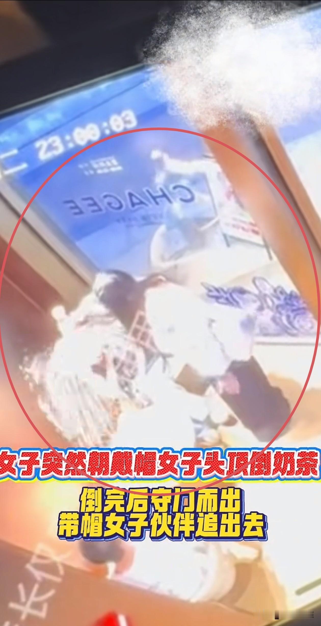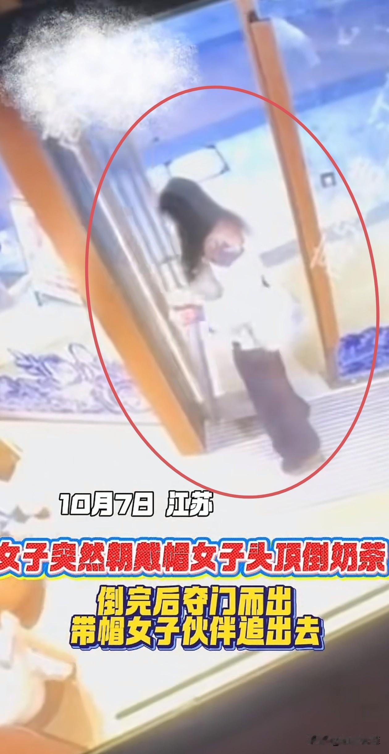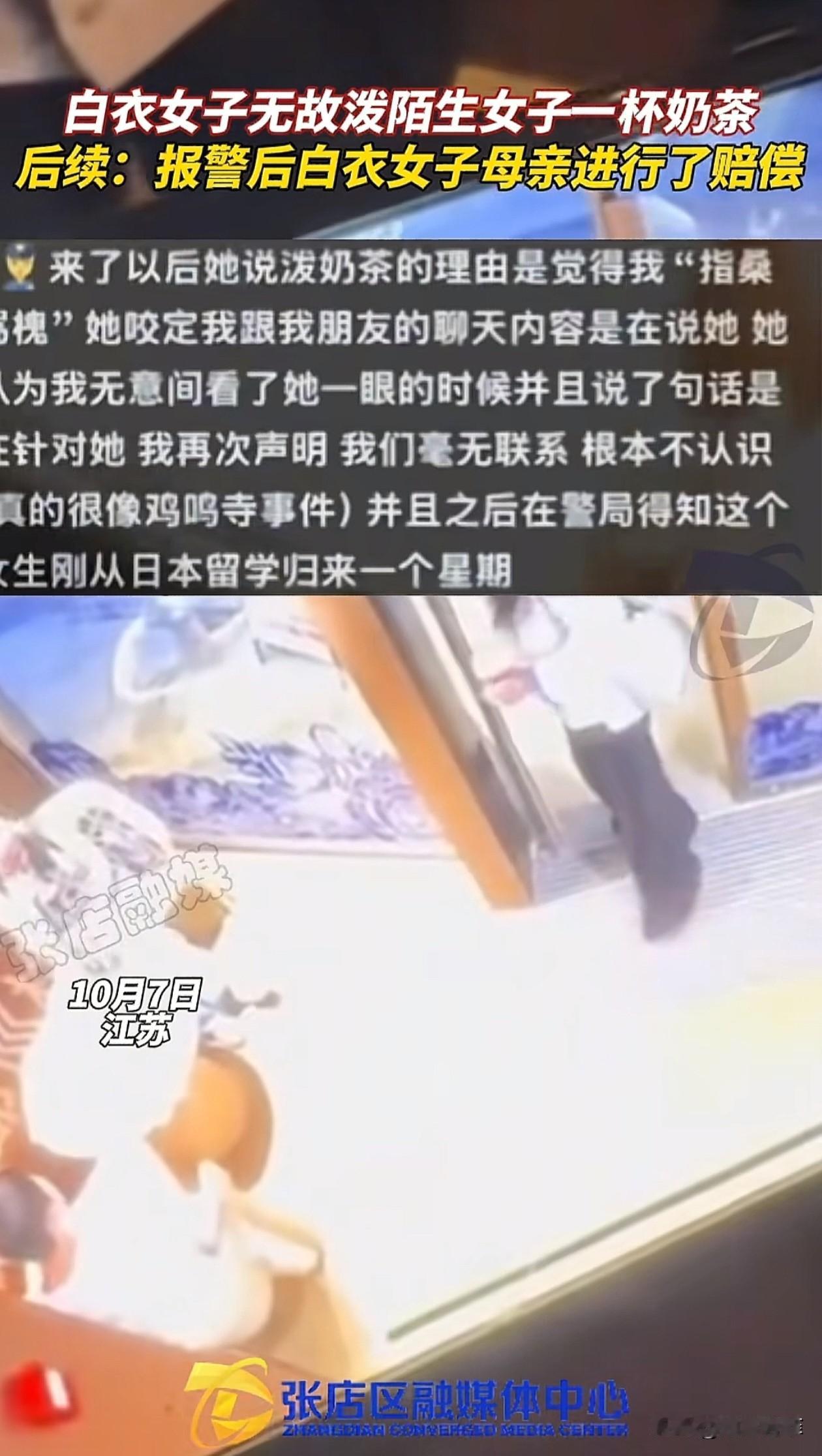 一戴帽女生和朋友聊天,旁边的一位白衣女子听见了,觉得她在指桑骂槐说自己,于是直接将一杯奶茶倒在了她头上,倒之前还先打开了门,倒完后拔腿就跑。后续:白衣女子的母亲出面进行了赔偿。 江苏,一家奶茶店里,戴帽子的女生正在和朋友聊天,跟白衣女子根本不认识。 白衣女子先假装出门,摸清逃跑路线,然后突然转身,把整杯奶茶直接扣在了戴帽女生头上,随后就往外跑。 ​ 戴帽女生的朋友反应很快,当场就追上去把人拦住了,之后就报了警。 民警询问白衣女子为什么这么做,她说自己听到了戴帽女生的谈话,觉得对方在指桑骂槐说自己,但她并没有任何证据。 ​ 而且面对被泼女生,白衣女子丝毫不觉得自己有错,还一直骂对方。后来被泼女生要求赔偿,她居然耍无赖说:“你也泼我一杯,这事就扯平了”。 最后还是白衣女子的妈妈赶过来,替她赔了钱,这事才算解决了。 白衣女子的行为真的太离谱了,她仅凭主观猜测就将奶茶泼向陌生女子,既不尊重他人,也没有责任意识。 她在事后不仅毫无悔意,还持续辱骂被泼女子,这种任性的行为也引发了许多网友的不满和批评。