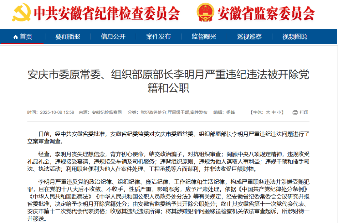 据安徽省纪委监委10月9日消息:日前,经中共安徽省委批准,安徽省纪委监委对安庆市委原常委、组织部原部长李明月严重违纪违法问题进行了立案审查调查。