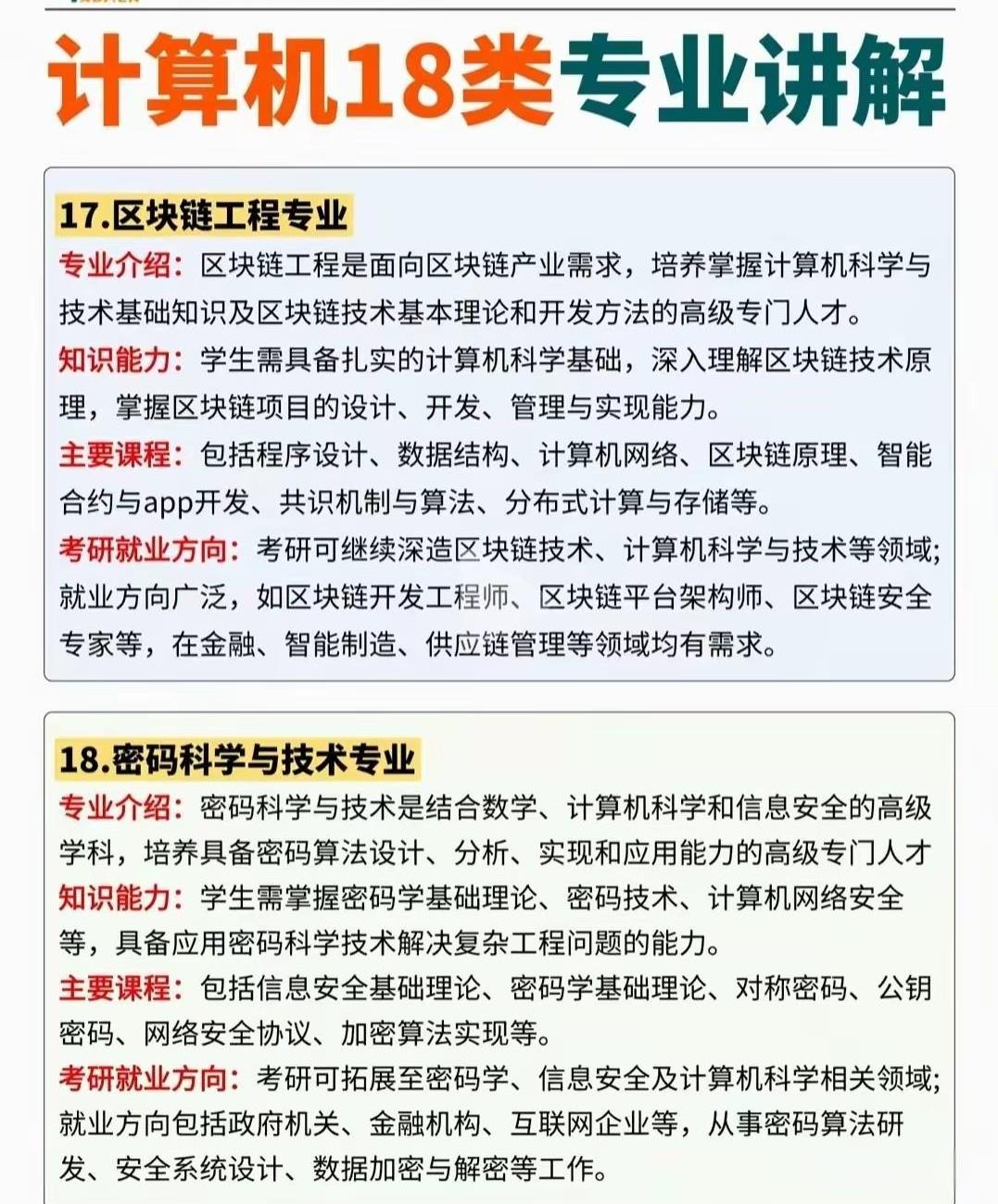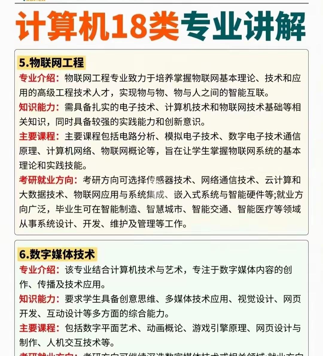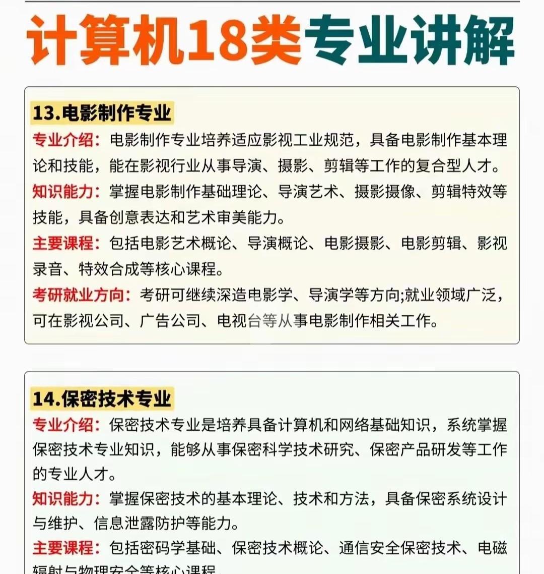 计算机类下面的18个具体专业及其相应的详细介绍,可以好好了解下每个不同的二级专业都需要学什么以及考研和就业方向。 计算机类下面的18个二级具体专业分别是如下: 1:计算机科学与技术 2:软件工程 3:网络工程 4:信息安全 5:物联网工程 6:数字媒体技术 7:智能科学与技术 8:空间信息与数字技术 9:电子与计算机工程 10:数据科学与大数据技术 11:网络空间安全 12:新媒体技术 13:电影制作 14:保密技术 15:服务科学与工程 16:虚拟现实技术 17:区块链工程 18:密码科学与技术 具体的专业介绍和相应的考研就业方向课程学习可以参考下面的图片进行进一步了解。