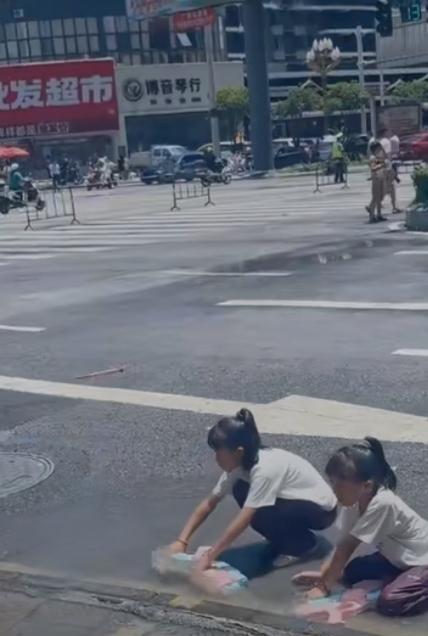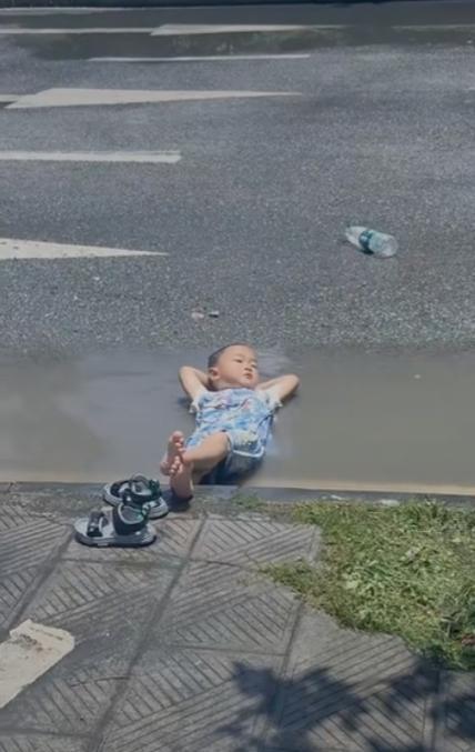 一小男孩头枕双手躺在马路牙子旁边的积水里,二郎腿一翘,悠哉悠哉,简直不要太爽!