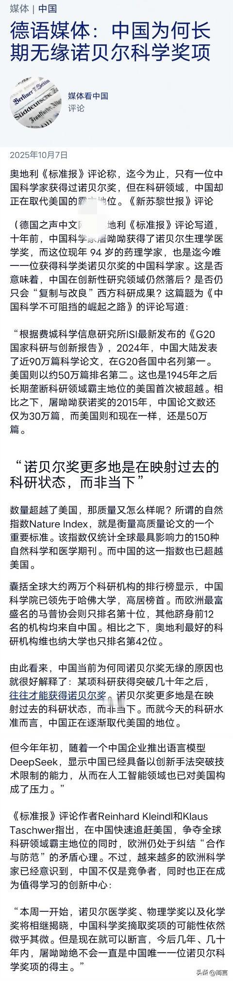 为何中国长期无缘诺贝尔奖?外媒给出了自己的答案。 奥地利《标准报》表示,我国的
