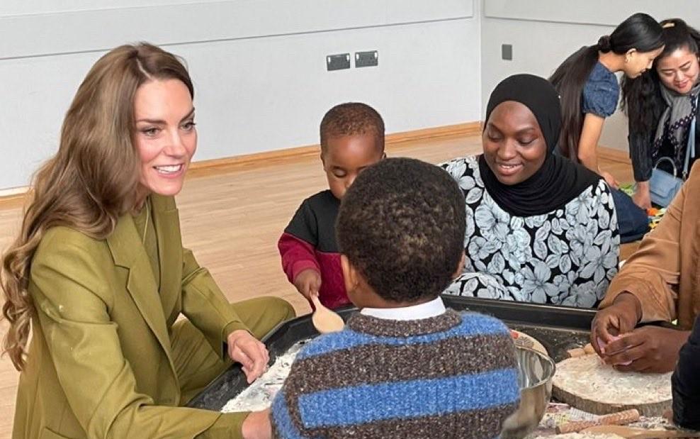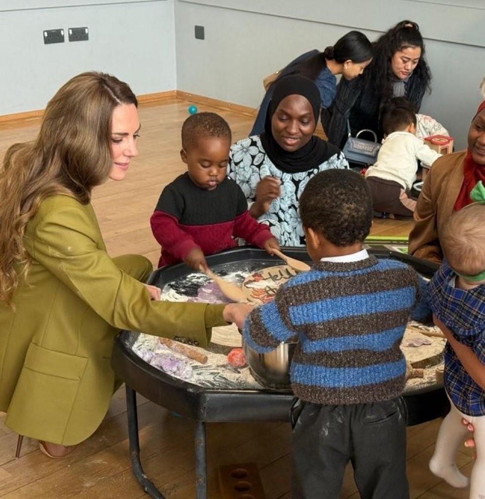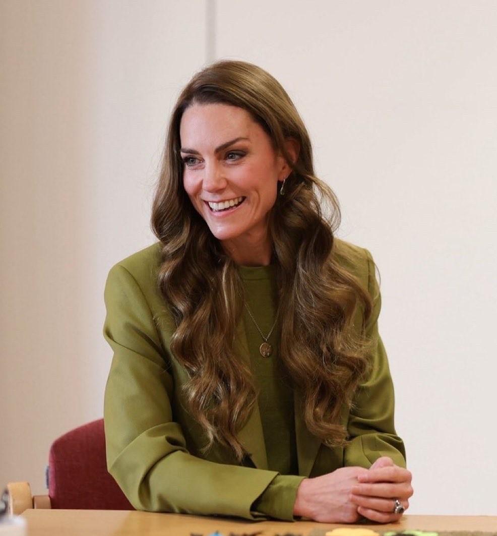 威尔士王妃凯特今日到访牛津郡家园建设计划项目时,身着芥末绿套装惊艳亮相,并与家人