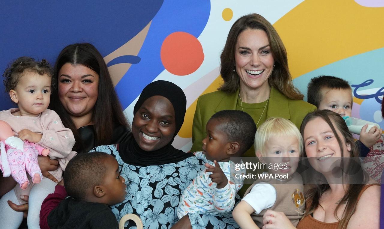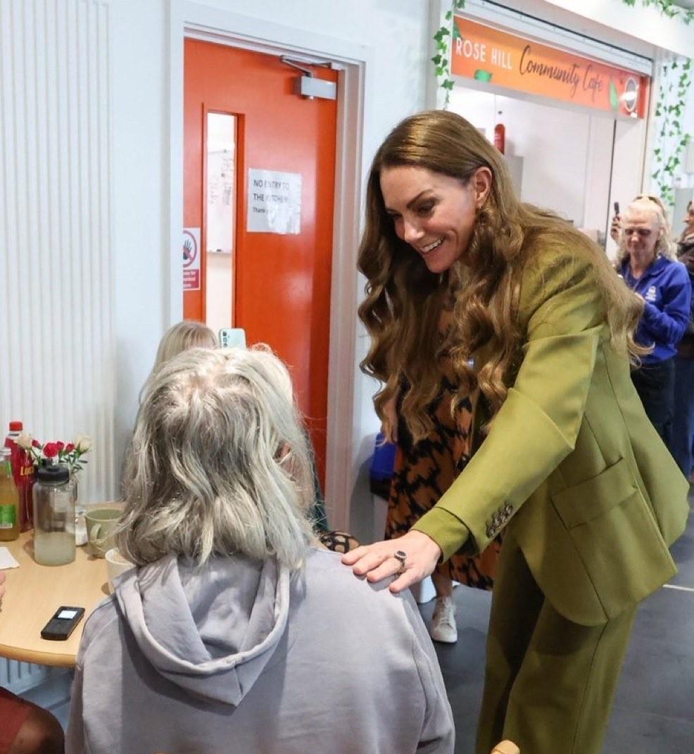 威尔士王妃凯特今日到访牛津郡家园建设计划项目时,身着芥末绿套装惊艳亮相,并与家人和志愿者们见面。