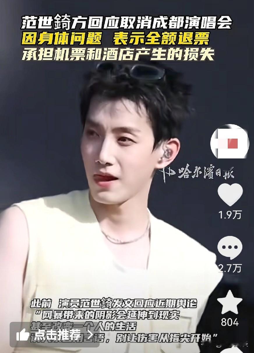范世琦取消成都演唱会我想到了。大家避雷周大福我也想到了。但是没想到哈尔滨日报赢了,就因为配乐“凉凉”竟然让大家拍手称赞。 范世琦因为身体原因不得不取消成都演唱会。也是太可惜了。 之前范世琦工作室曾表示9月一直在忙于演唱会事宜。 忙碌了一个月,却因为身体原因取消了。还要全额退票,还要补偿大家的交通住宿。 这损失太大了。 也不知道范世琦身体出了什么严重的问题? 大家知道吗?