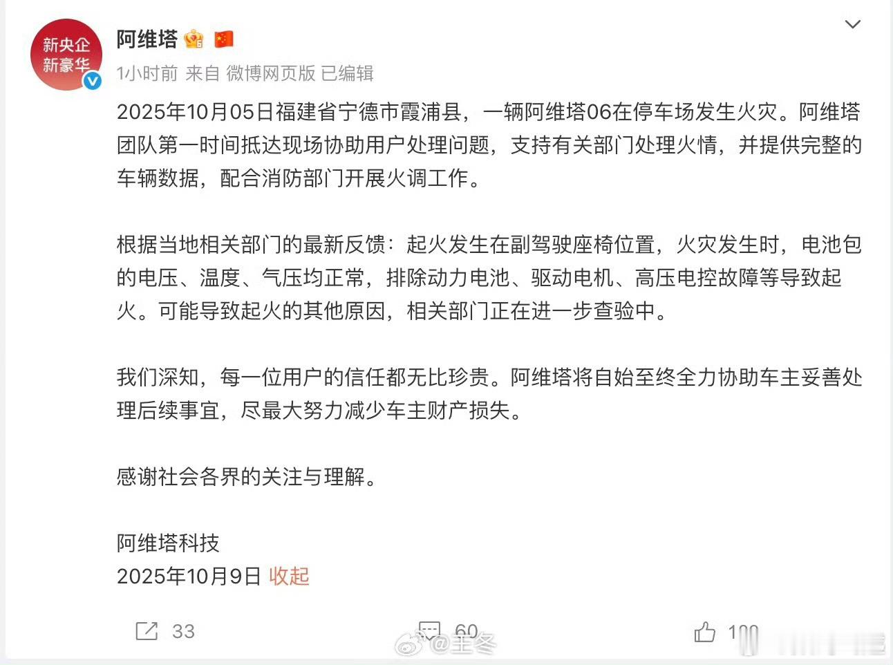 阿维塔回应一车辆起火致7车烧毁正常放置的汽车还没有见过,会自动起火的,看来这件事