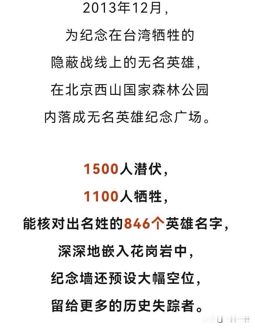 北京西山广场,刻着1100个不该被忘记的名字! 《沉默的荣耀》最近央视热播中, 无名英雄纪念广场的故事,又有多少人知道呢? 上世纪50年代,1500个普通人,揣着信仰去了台湾。 他们装成小贩、难民,工商人士…在虎穴里藏着忠魂。 可1100人最终没能回来,很多人连名字都没能留下。 直到2013年,这处广场立在了西山。 位于北京西山国家公园内。 花岗岩墙上刻着846个能找到的名字, 还有空位等着——等更多英雄被记起。 广场上那句诗特戳人:“惊涛拍孤岛,虎穴藏忠魂”, 这是写给吴石将军的,也是写给所有无名英雄的。 蒋碧玉说“为祖国流第一滴血,光荣”, 朱枫、陈宝仓他们,最后倒在了台北刑场。现在马场町成了公园,可当年的血不能白流。 咱们现在的安稳,是他们用“看不见的战斗”换来的。 有空可以去西山走走吧, 不用多隆重, 就站在他们名字前说句“记得你”, 就够了。 无名的纪念碑