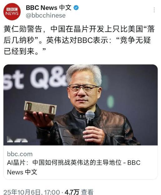 现在才知道紧张,是不是有点晚了?美国当地时间10月6号黄仁勋在接受bbc采访时表示。我们必须要重视起来了,中国在芯片开发上只比美国落后几纳秒而已!竞争毫无疑问已经到来了! 黄仁勋这话可不是随便喊喊的口号,这位在芯片圈摸爬了快四十年的大佬,看技术趋势的眼光比那些整天唱衰中国的“懂王”准多了,他不过是把行业里大家心照不宣的实情摆到了台面上。 毕竟英伟达自己就身处竞争最前线,中国芯片的进步速度他们最有体会。 美国前两年的操作其实挺自信,拿着出口管制当王牌,觉得断了设备和软件供应,中国芯片就只能停在图纸上。 一会儿卡设计工具,一会儿禁制造设备,把AI芯片当成重点围堵目标,满以为这样就能把中国的芯片路堵死。 结果呢?国内芯片厂悄摸摸把AI芯片造出来了,算力跟英伟达的旗舰型号掰手腕都不怵,真就像黄仁勋说的,差距就差那么几纳秒。 更别说AI基础设施市场这块肥肉,中国已经啃下了不小的份额,毕竟造东西这事儿,咱们本来就拿手。 黄仁勋敢这么直白,其实藏着英伟达的小九九。中国市场可是块谁都舍不得丢的香饽饽,他自己都承认“任何认为中国市场不重要的人都在自欺欺人”。 前两年美国把高端芯片纳入管制,英伟达光损失就计提了几十亿美元,眼睁睁看着中国企业自己搞出替代产品,能不急吗? 现在中国芯片不仅能满足自家需求,还开始往海外走,价格还比国际品牌实在,这要是再不让英伟达进来竞争,自家市场份额怕是要被啃得更狠。 美国那边这会儿才喊“要重视”,早干嘛去了?之前拿着管制清单当尚方宝剑的时候,怎么没想着技术优势会缩水这么快。 黄仁勋都点破了,那些说“中国造不出AI芯片”“制造能力不行”的说法全是凭空捏造。 咱们这边不仅芯片造出来了,连AI推理、后训练这些配套的软功夫都跟上了,毕竟现在的AI早不是单一模型,而是多模块协同的复杂系统,软硬件得一起抓才行。 更有意思的是,中国压根没按美国预想的节奏出牌。先进制程暂时有难度,就先把成熟制程做到极致,还搞起了开源架构,成本一下降了不少,东南亚市场一半的订单都被咱们拿了下来。 反观美国,一边想保住技术垄断,一边又舍不得中国市场的红利,政策左右摇摆,企业夹在中间难受得很。 英伟达盼着能放开限制,毕竟AI基建市场还有四五倍的增长空间,少了中国玩家怎么行。 说白了,黄仁勋这话既是给美国敲警钟,也是给自己争取机会。他心里门儿清,中国芯片已经追上来了,再想靠垄断卡脖子根本不现实。 美国现在才紧张,确实有点晚了——技术这东西,一旦有人追上来,想再拉开差距可就难了。这竞争哪是刚露头,早就打得热火朝天了,接下来就看谁能扛住节奏了。