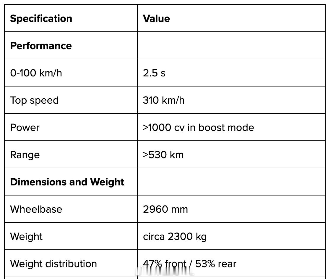 在中国的小米和仰望飙赛道的时候,法拉利官宣了首款纯电车型——Elettrica的技术规格,配备122千瓦时电池、四电机系统,总功率超过1000马力,0-100公里/小时加速仅需2.5秒,最高时速310公里。续航超过530公里,采用880伏高压平台和350千瓦快充能力。电机转速高达3万转,采用源自赛车的Halbach磁阵与碳化硅逆变器,整车重量分布47:53,悬架、转向和四电机控制实现“每个车轮都能被独立精准掌控”。