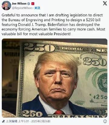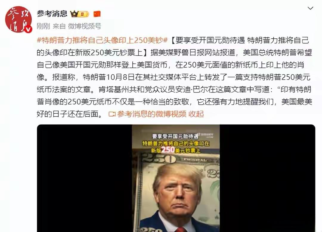 据报道,特朗普的头像不仅要出现在1美元的硬币上,还要出现在新面值250美元的纸币上。 不知道为什么偏偏要新印制250美元面值的纸币,把特朗普的头像放在纸币上,四周都是“250”字样,总感觉怪怪的,友友们觉得呢?欢迎在评论区分享交流。