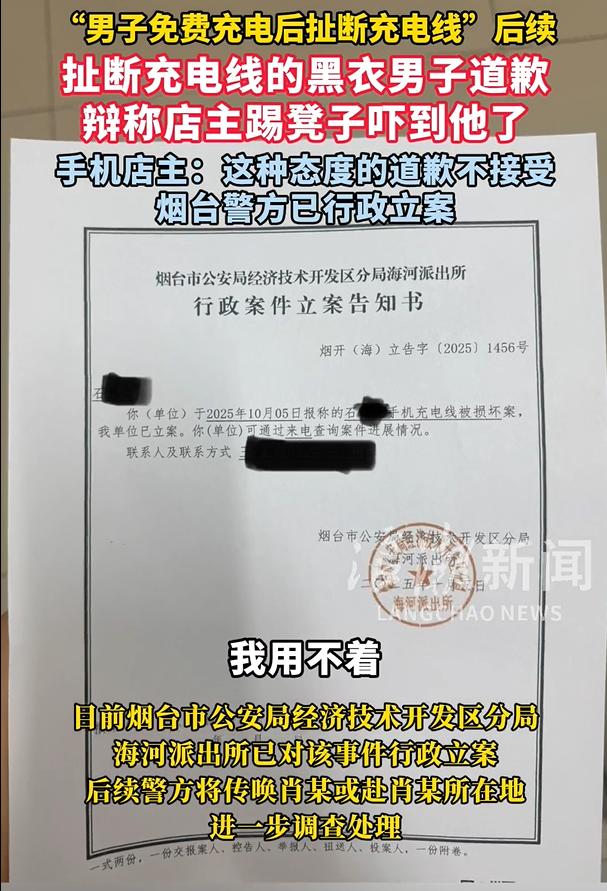 山东烟台,一男子在手机店充电时,因老板突然挪了下凳子而被吓后,直接将店里多根充电