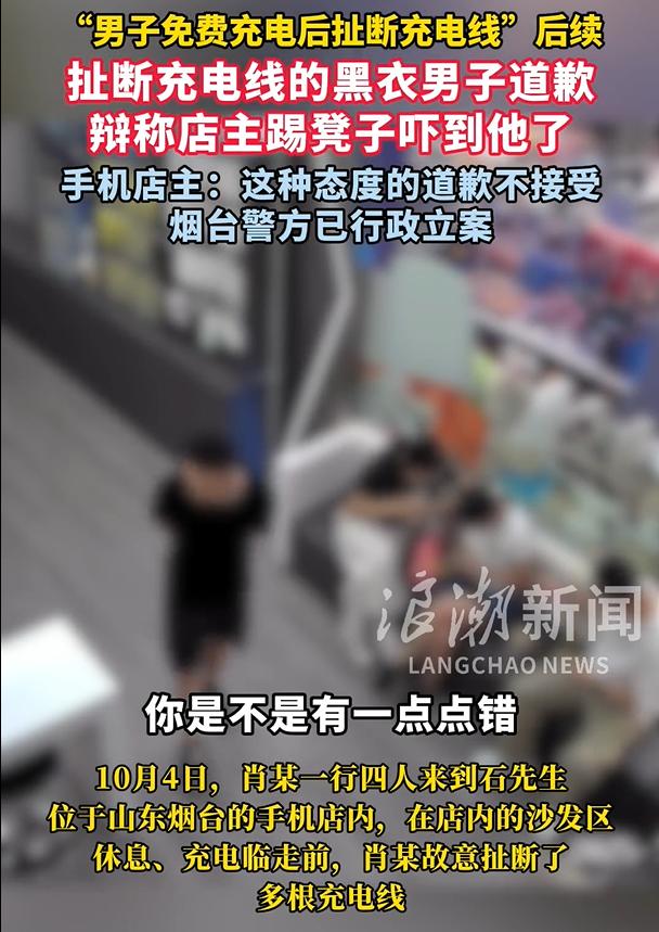 山东烟台,一男子在手机店充电时,因老板突然挪了下凳子而被吓后,直接将店里多根充电线扯断,随行女子还将嘴里的东西吐出塞在沙发缝隙处。老板曝光此事后,这对男女竟指责老板网暴他们,还表示要起诉老板维权。然而警方介入后,这名男子是道了歉,不过老板认为对方道歉不诚恳,所以表示不接受道歉。 据浪潮新闻10月9日报道,在10月4日当天,男子肖某等4人来到石先生的手机店内休息。石先生为了方便顾客,就在沙发旁放了些充电线,以供顾客免费充电。 肖某和随行人员一边充电一边闲聊,这时石先生修完手机走出房间准备休息下,他看到有顾客离开后,原本在桌子底下的凳子没有归位,于是就用脚推了下凳子。 按照常理来说,石先生的动作是十分家常的行为,很多人在自己家也会这么做,可石先生的举动却把肖某等人给吓到了。 肖某也没有去找石先生理论,在充完电后直接把店里的几根充电线给扯断了,以发泄石先生刚才吓到他的怒气。 同时与肖某随行的一名女子从嘴边拿了一团东西塞进了沙发缝隙。之后,肖某等人离开了手机店。 石先生发现手机充电线被扯断后,气得找视频发到了网上,并报了警。 肖某在网上看到视频后,打电话联系石先生进行了道歉,然而这个道歉让石先生十分的不满。 肖某虽然承认了自己有错,但却指责是石先生踢凳子吓到他在先,还称大家都是大老爷们,让石先生承认自己也有一点点的错。 石先生感到十分无语,肖某一开始都不承认自己弄的,直到监控视频调取了出来他才承认,而且就肖某的道歉行为来看,他认为并不诚恳,所以没有接受肖某的道歉。 由于此事的发酵,导致网友们对肖某和随行的一名女子指责声不断。有网友质疑女子将口香糖黏在沙发缝隙。 万万没想到,女子联系到石先生后,将其一顿指责,还说石先生污蔑她,她并没有把口香糖黏在沙发缝隙,所以她打算起诉石先生维权。 石先生事后也没查看沙发缝隙,但他怀疑是奶茶吸管包装纸。 有网友表示:“这还大老爷们?大老爷们压根就不会干这丢人的事。” 还有网友表示:“绝对不要接受道歉,一个大老爷们因为挪凳子被吓到,就报复扯断充电线?这摆明了就是自私的人。” 如果石先生不接受肖某的道歉,肖某是否会受到处罚呢? 其实不管石先生是否有过错,肖某都不该扯断充电线,这显然属于故意损坏他人财物。 不过,损坏公私财物达5000元以上的,才会构成犯罪,所以肖某的行为尚不构成犯罪。 但是不构成犯罪不代表其行为就是对的,肖某故意毁坏石先生的财物的行为是事实存在的。既然石先生没有选择接受肖某的道歉,那公安机关应当对肖某予以行政处罚。 《治安管理处罚法》第49条规定,盗窃、诈骗、哄抢、抢夺、敲诈勒索或者故意损毁公私财物的,处5~10日拘留,可以并处500元以下罚款;情节较重的,处10~15日拘留,可以并处1000元以下罚款。 因此,对于肖某的行为,最低也要处5日行政拘留的处罚。 至于女子说石先生污蔑她,这纯属子无须有。 石先生的确是将视频发了出去,但他并未明确表示女子将口香糖黏在沙发缝隙,是网友在怀疑是口香糖,所以向石先生进行了确认。 因此,女子即便起诉石先生,也会因为没有证据而败诉。 那石先生将视频公布出来,是否侵犯女子等人的隐私、肖像呢? 《民法典》第1018条规定,自然人享有肖像权,有权依法制作、使用、公开或者许可他人使用自己的肖像。第1032条规定,自然人享有隐私权。任何组织或者个人不得以刺探、侵扰、泄露、公开等方式侵害他人的隐私权。 隐私权包含了私密空间、私密活动、私密信息等。比如:自然人的姓名、出生日期、身份证件号码、生物识别信息、住址、电话号码、电子邮箱、健康信息、行踪信息等。 肖像权包含了:制作权、使用权、公开权、许可他人使用权等。 注意,如果商家未经同意,利用顾客的肖像权、隐私权等进行牟利,这肯定是违法的。 但石先生将视频发出来,只是将肖某的违法行为和女子的不当行为给公布出来,用于教育大家不要做这种违法或者不当行为,属于具有教育意义的公布,且石先生对于视频进行了模糊处理。 因此,石先生的行为并不属于违法。 目前,警方已经立案,并打算传唤肖某做进一步调查。 对此,您怎么看?欢迎留言交流。