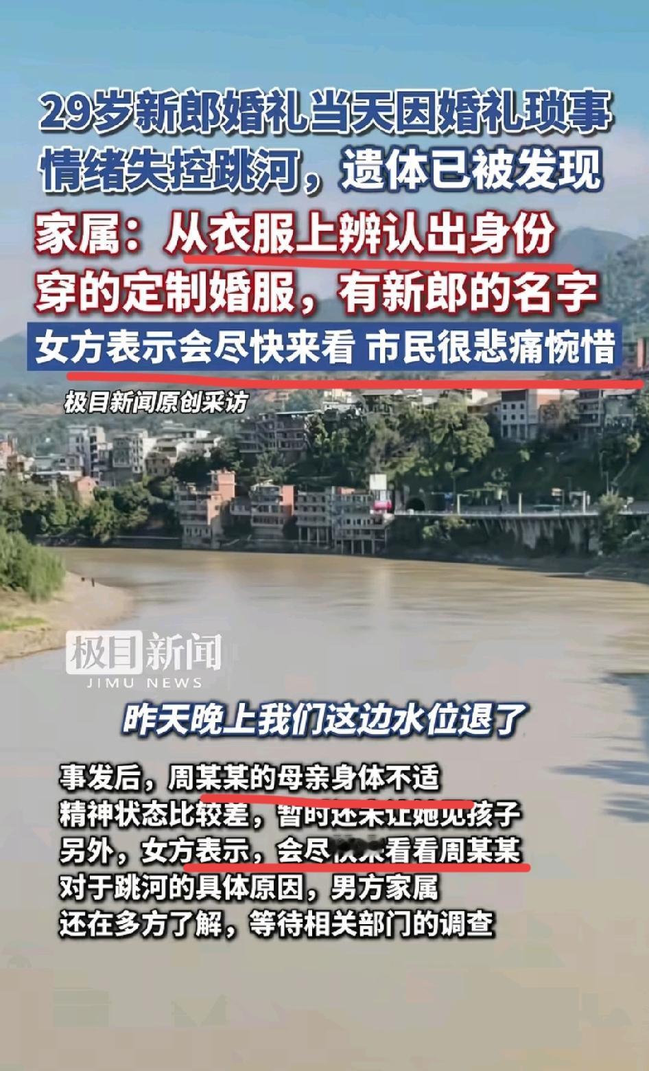 3号跳的,9号找到的,整整在水里泡了6天,只能从衣服上的名字辨认是他。 傻孩子,到水里那一刻,后悔也来不及了。 新郎妈妈没来殡仪馆是别人瞒着先不让看,女方是自己表示“会尽快来看”。 能把他当成心头肉的,不还是生养他的父母吗?! 不管因为什么原因,29岁的大小伙子这样做都太糊涂,婚日变祭日,白发人送黑发人。 不值啊!