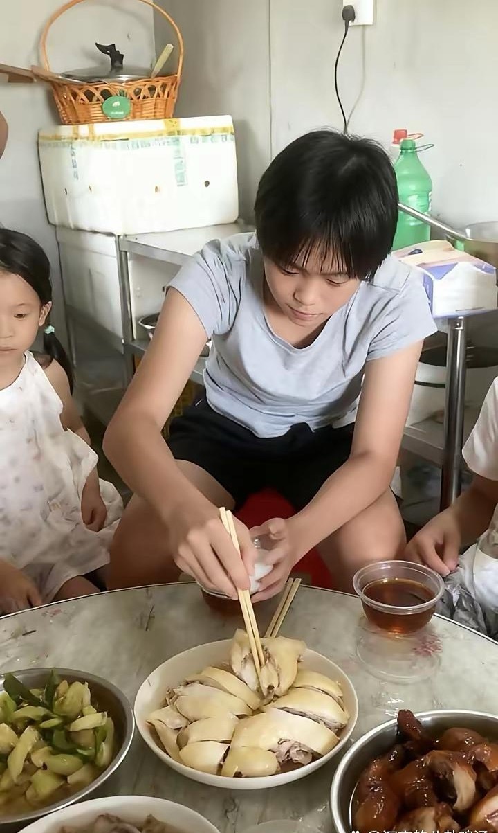 圆桌中央的白斩鸡切得整整齐齐,她拿着筷子给弟弟妹妹分肉,灰色T恤配黑短裤,和电视里那个十米台霸主判若两人
