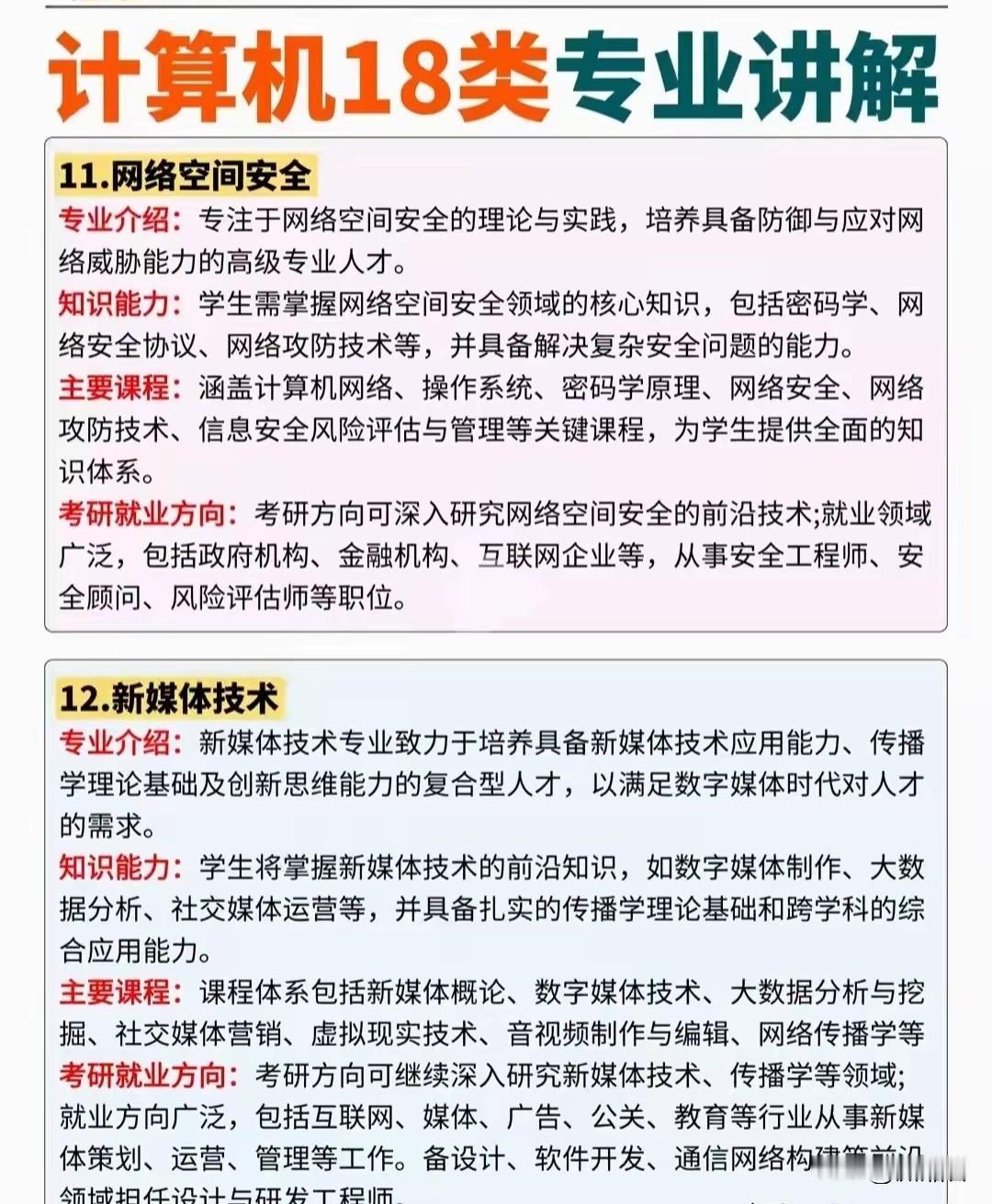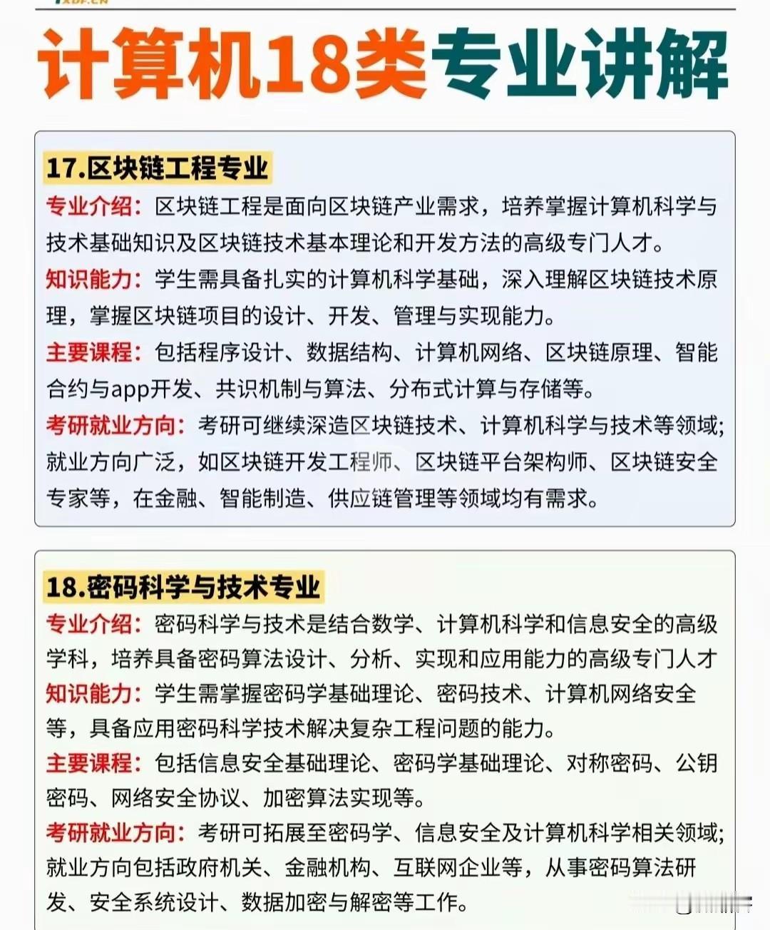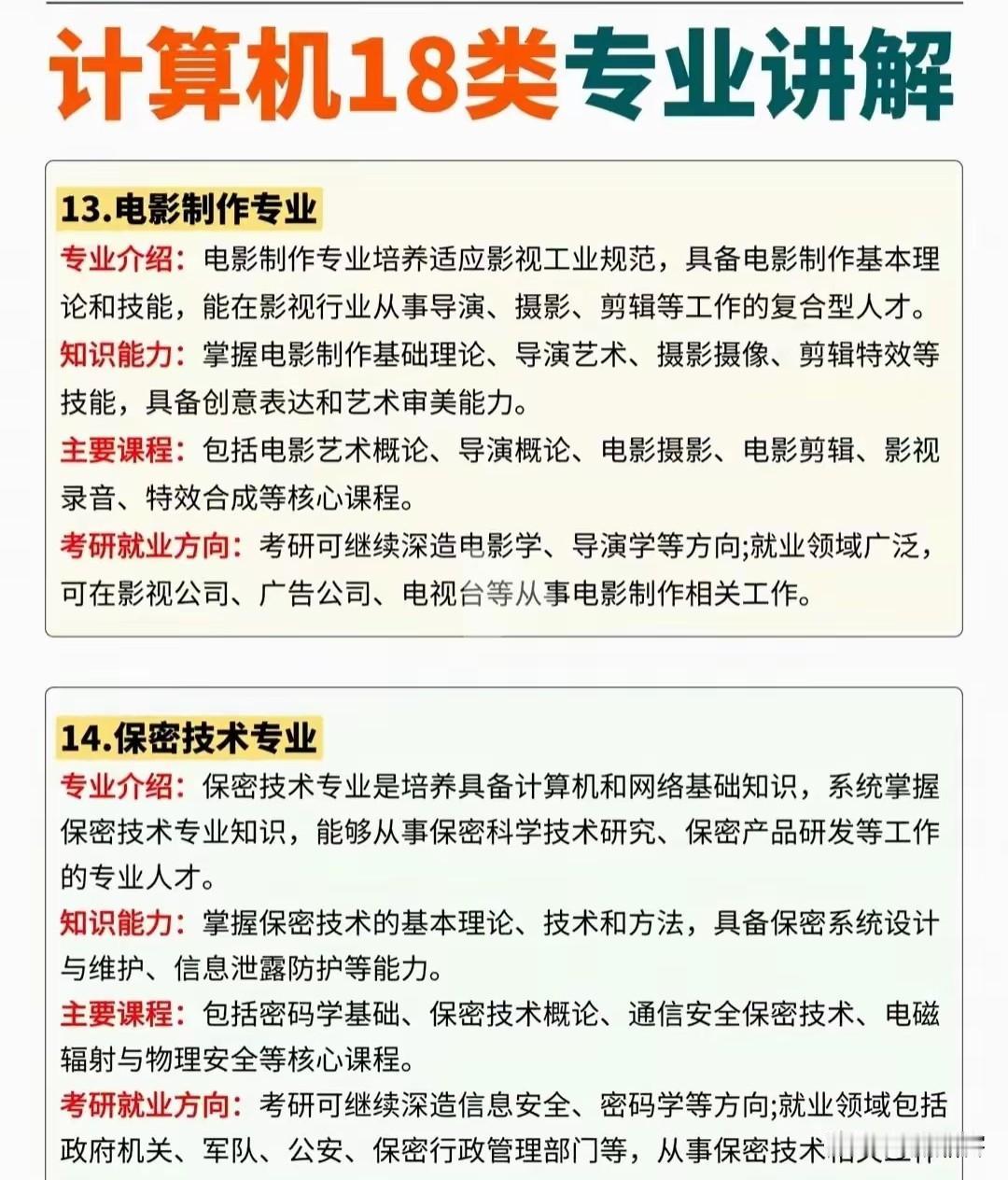 计算机类下面的18个具体专业及其相应的详细介绍,可以好好了解下每个不同的二级专业都需要学什么以及考研和就业方向。 计算机类下面的18个二级具体专业分别是如下: 1:计算机科学与技术 2:软件工程 3:网络工程 4:信息安全 5:物联网工程 6:数字媒体技术 7:智能科学与技术 8:空间信息与数字技术 9:电子与计算机工程 10:数据科学与大数据技术 11:网络空间安全 12:新媒体技术 13:电影制作 14:保密技术 15:服务科学与工程 16:虚拟现实技术 17:区块链工程 18:密码科学与技术 具体的专业介绍和相应的考研就业方向课程学习可以参考下面的图片进行进一步了解。