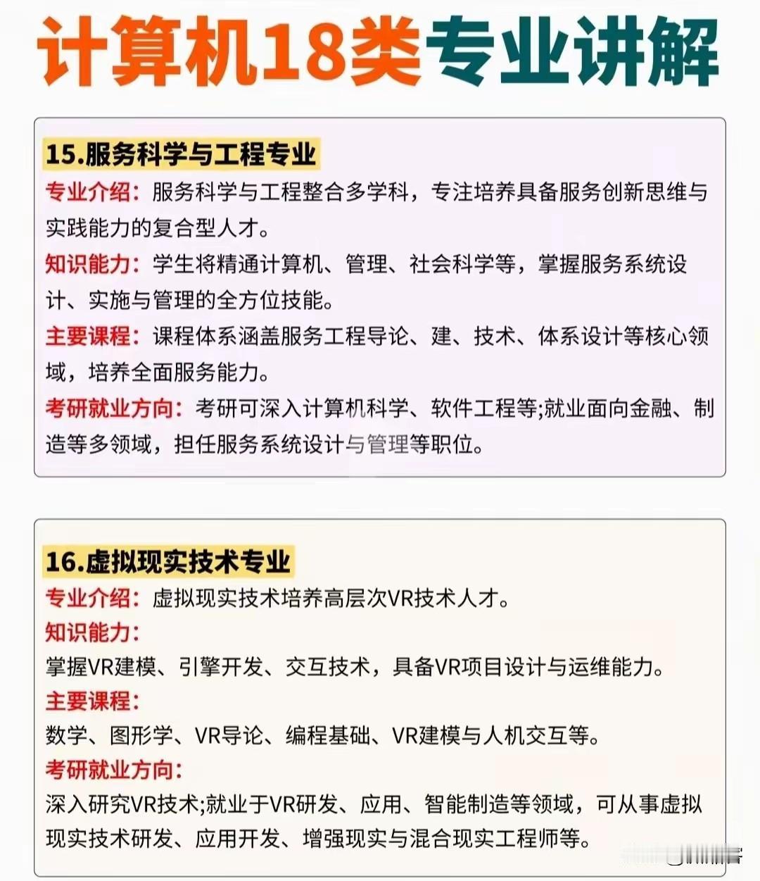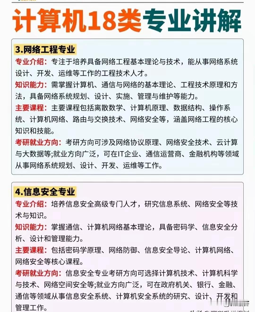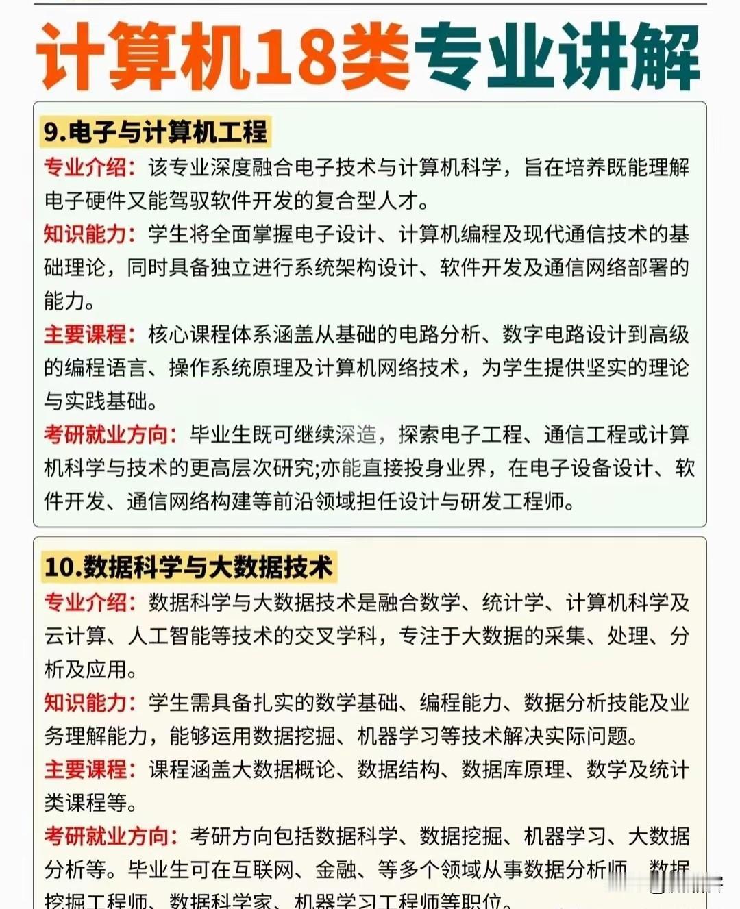 计算机类下面的18个具体专业及其相应的详细介绍,可以好好了解下每个不同的二级专业都需要学什么以及考研和就业方向。 计算机类下面的18个二级具体专业分别是如下: 1:计算机科学与技术 2:软件工程 3:网络工程 4:信息安全 5:物联网工程 6:数字媒体技术 7:智能科学与技术 8:空间信息与数字技术 9:电子与计算机工程 10:数据科学与大数据技术 11:网络空间安全 12:新媒体技术 13:电影制作 14:保密技术 15:服务科学与工程 16:虚拟现实技术 17:区块链工程 18:密码科学与技术 具体的专业介绍和相应的考研就业方向课程学习可以参考下面的图片进行进一步了解。