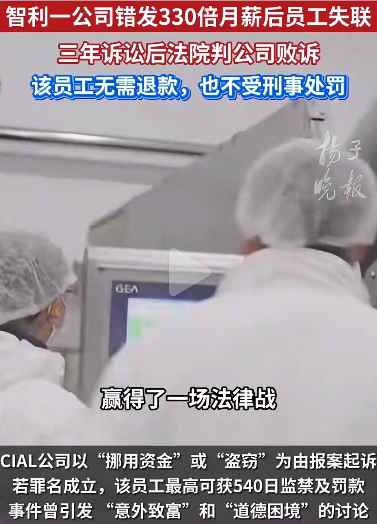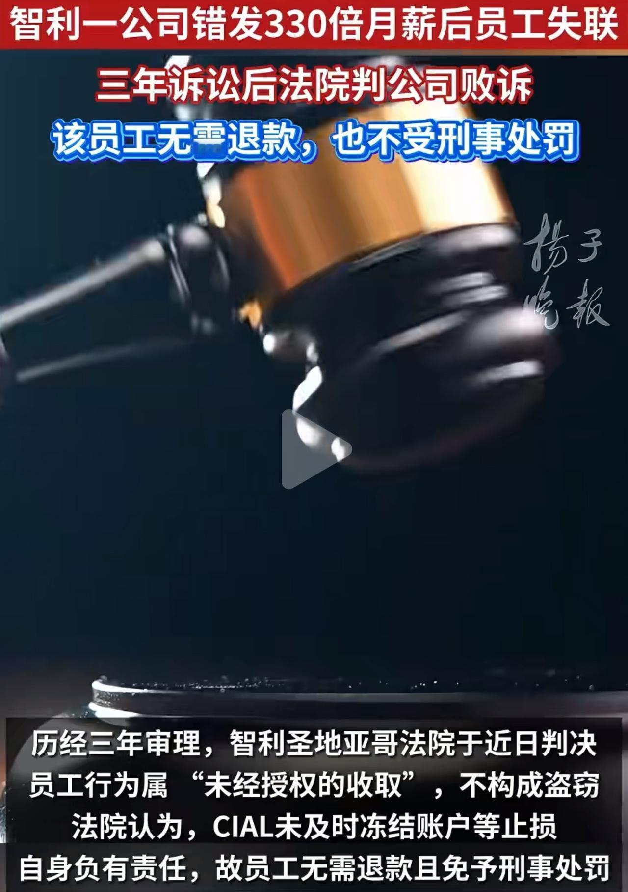 月薪才3700,突然收到123万工资到账短信,换你你咋整?智利有个办公室小职员,一开始还挺实在,主动跟领导说“钱打多了,我回头退回来”,结果才过3天,直接递了辞职信,把银行卡里的钱全转走,人也找不着了。 公司气得直跳脚,直接以盗窃报了警——要知道这钱是他330个月的工资,按当地法律,真要是盗窃罪成立,最多得蹲540天牢。谁能想到今年9月法院判下来:钱不用退,人也不算犯罪! 不是都说“白拿的钱得还”吗?法院说的理儿倒挺有意思:人家员工一开始就说了钱打错了,该尽的告知义务做到了;反倒是公司,明明知道钱给多了,3天里连个冻结账户的动作都没有,眼睁睁看着钱被转走,自己的过失比谁都大。 这事要是搁咱国内,压根不是这么回事。之前贵州有家公司,不小心给已经离职的员工多打了三千多块工资,最后还是法院帮忙,把这笔钱全要回来了;还有江苏一个打工的师傅,多拿了公司三千块工资,自己主动退回去了,公司后来还特意好好谢了他。咱国家《民法典》写得清清楚楚,不管是谁的错,平白无故得的钱必须还,要是故意不还,说不定还得额外赔利息。 我倒觉得法院这么判挺合理的——说白了就是给那些办事毛躁的企业敲敲警钟,自己财务上出了漏子,别想着往员工身上推责任。不过这员工的操作是真不地道,就算没犯啥法,可做人最该有的诚信,早让他自己抛到脑后去了。 你们觉得这钱该还不?要是你碰到这种事,会咋做?多发工资不退回犯法吗 多发工资要不要退还公司